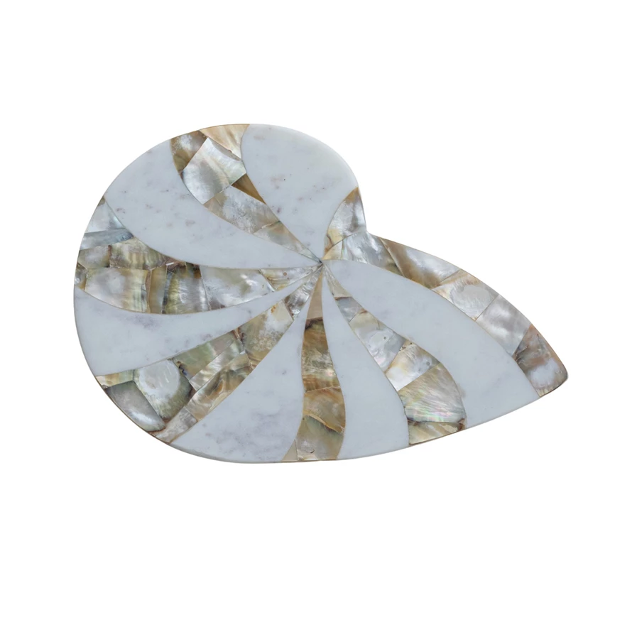 Catalog Name: 12"L x 8"W Marble Nautilus Shaped Cheese/Serving Board w/ Mother of Pearl Inlay, White & Natural (Each One Will Vary)