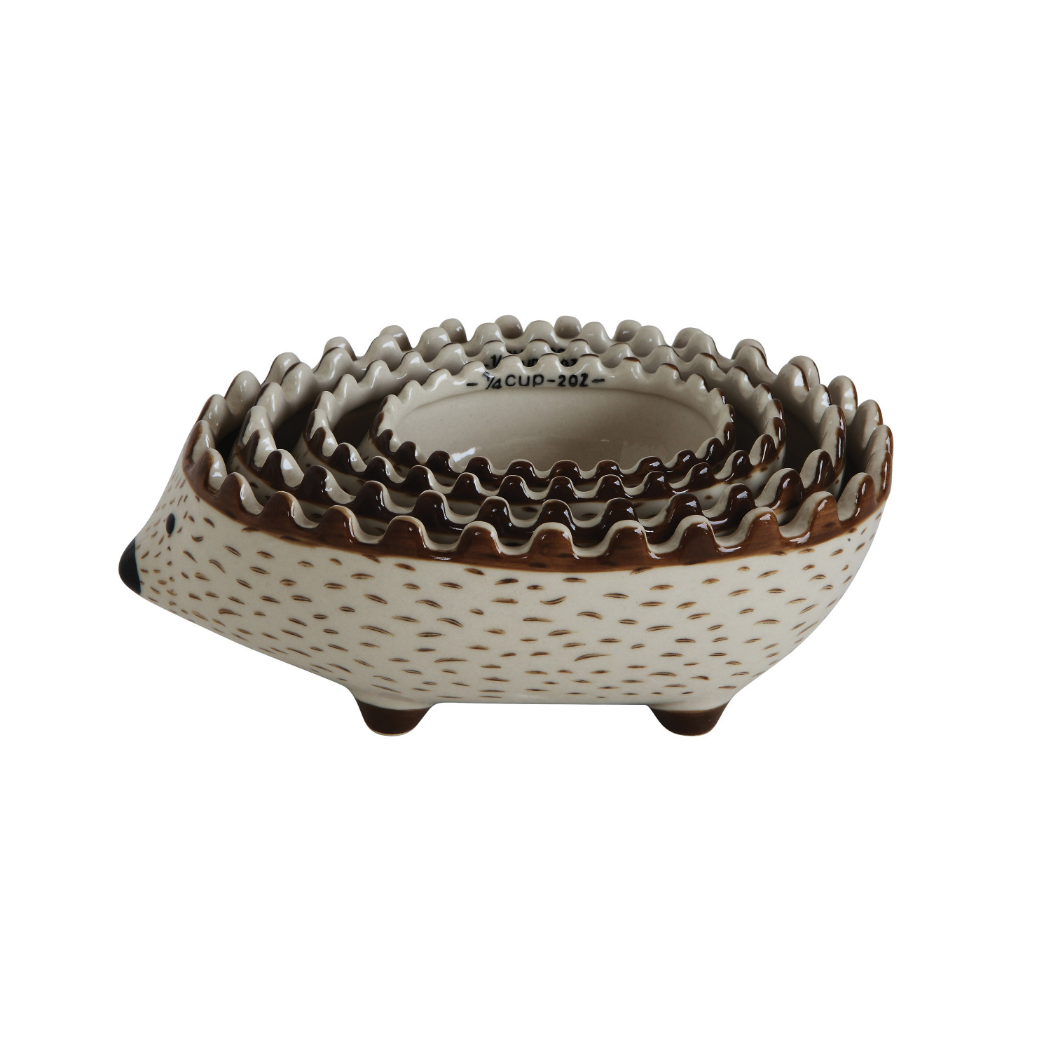 Catalog Name: 1-1/2, 1, 1/2 & 1/4 Cup Hand-Painted Stoneware Hedgehog Measuring Cups, Cream Color & Brown, Set of 4