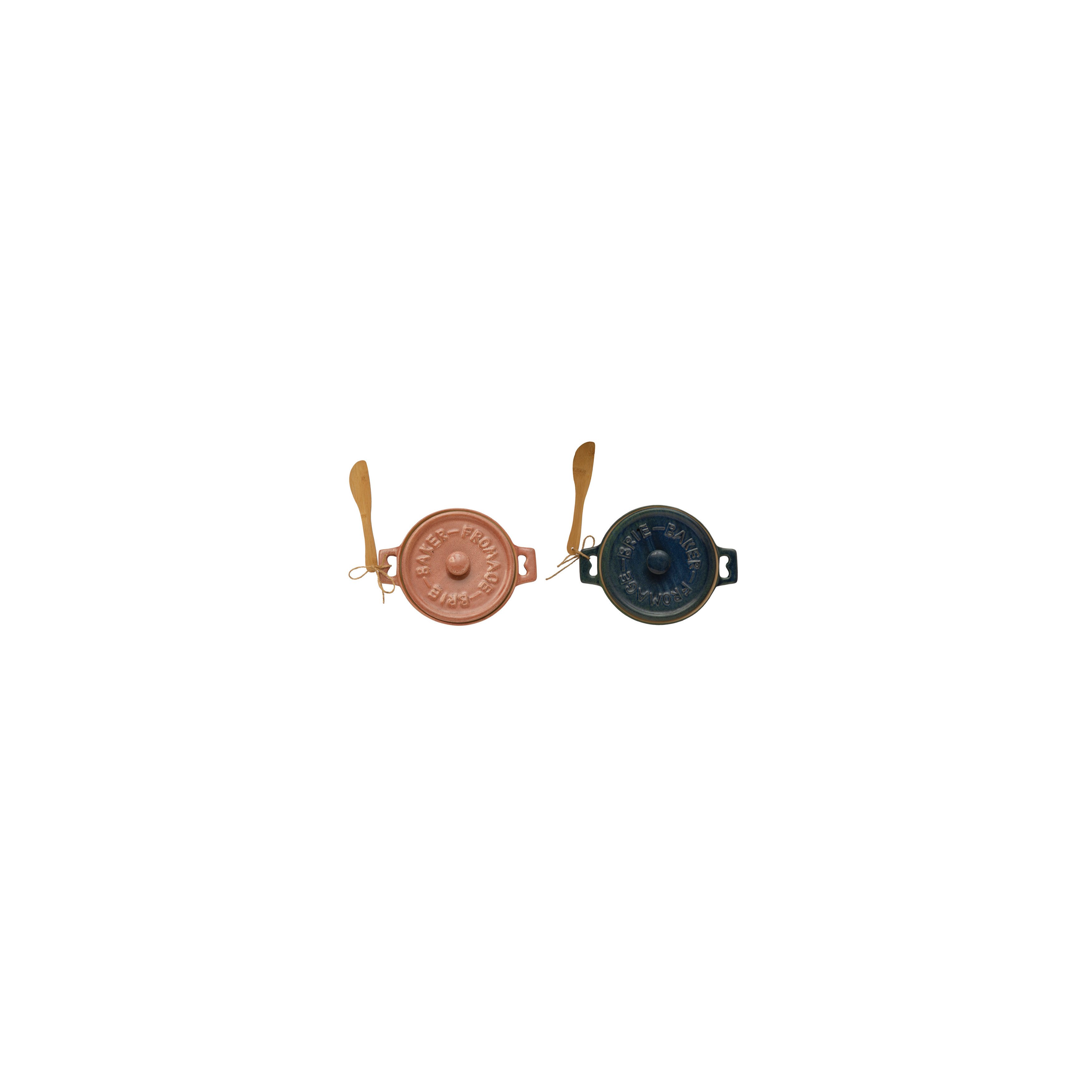 Catalog Name: 7" Round x 3-1/4"H Stoneware Brie Baker w/ Bamboo Spreader, Reactive Glaze, Blue, Set of 2 (Each One Will Vary)