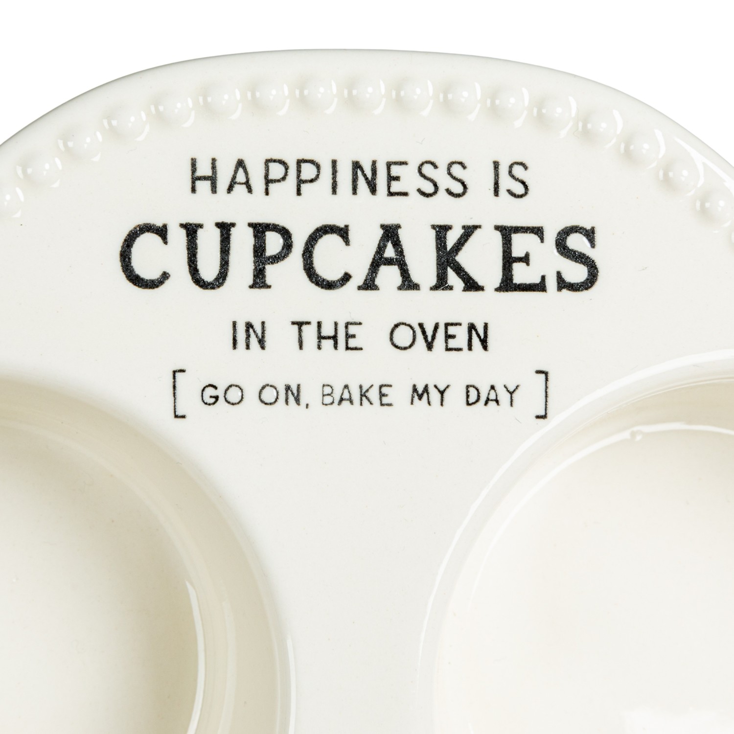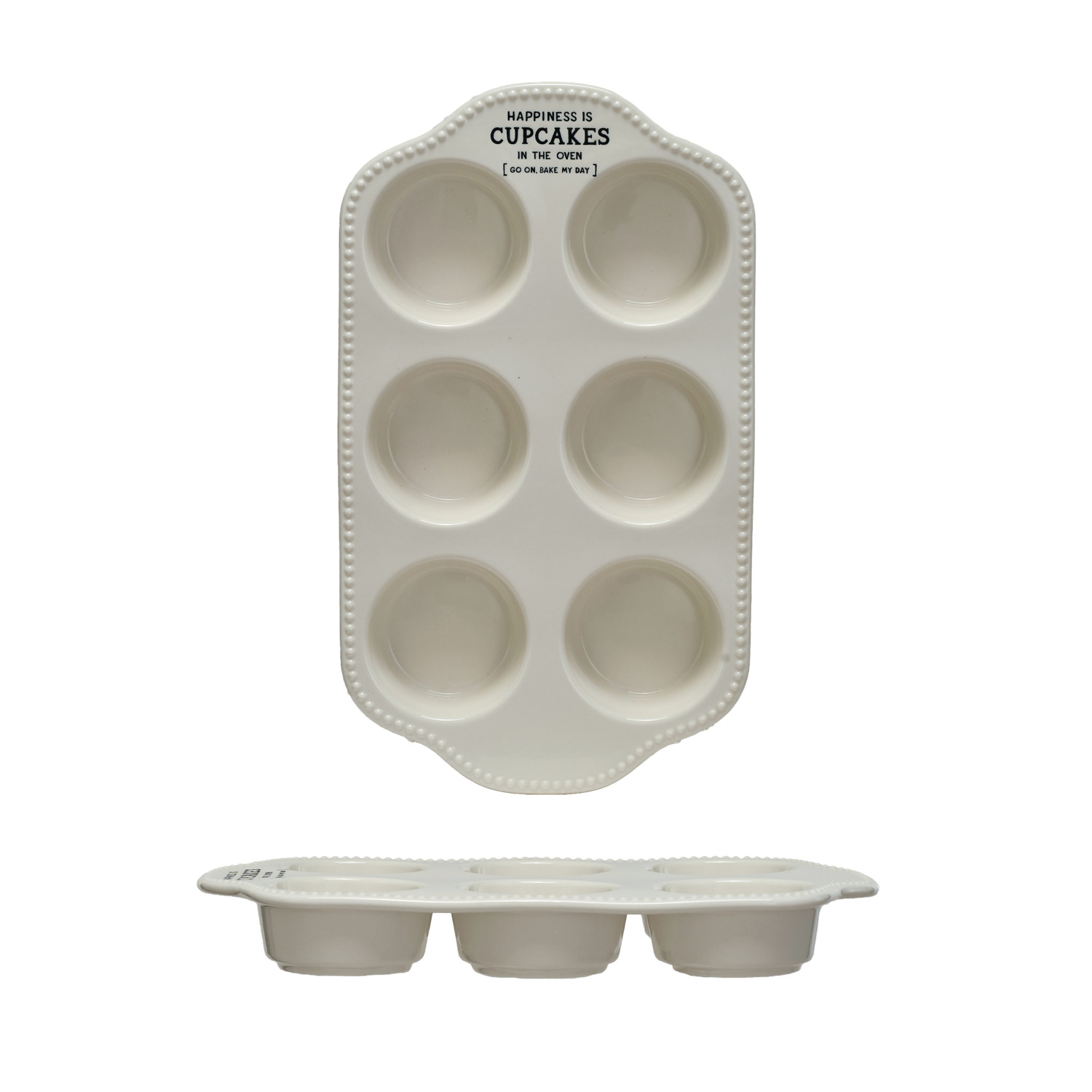 This 12-inch long, and 7-inch wide stoneware muffin pan is a baker's delight, complete with an uplifting message that reads "Happiness Is Cupcakes..." The rectangular pan, featuring six molds, is ideal for whipping up a batch of every favorite cupcake. Crafted from white stoneware, it not only bakes efficiently but also adds a touch of elegance to the kitchenware. Its charming design fits well within eclectic, farmhouse, or French country themes, inviting a warm, homemade feel to every culinary creation. Whether it's a weekend treat or a special occasion, this muffin pan is sure to spread happiness, one cupcake at a time.