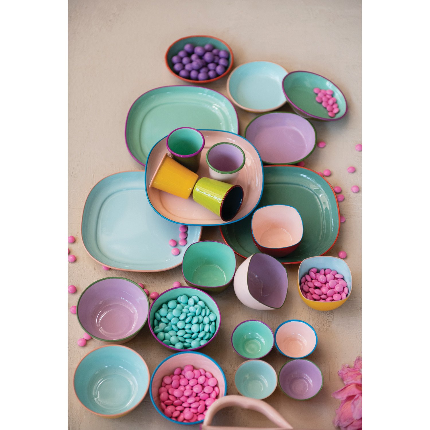 Catalog Name: 3-1/4" Square x 2"H Enameled Stainless Steel Bowl w/ Colored Edge, 4 Colors