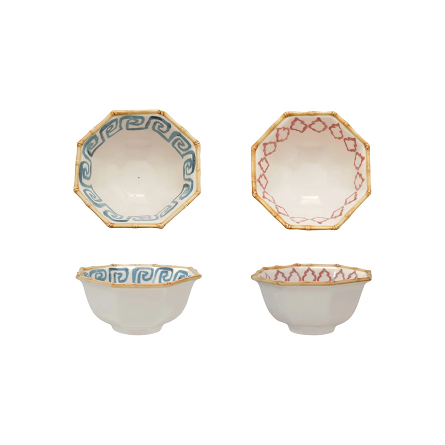 Catalog Name: 6"L x 6"W Hand-Painted Stoneware Octagon Shaped Bowl w/ Pattern & Bamboo Style Rim, Multi Color, 2 Styles