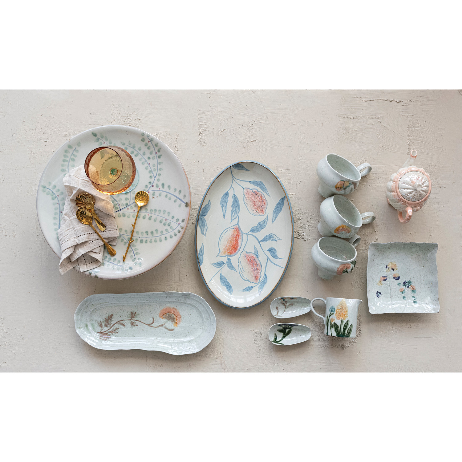 Hand-Painted Stoneware Organic Shaped Plate with Flowers (Each One Will Vary)