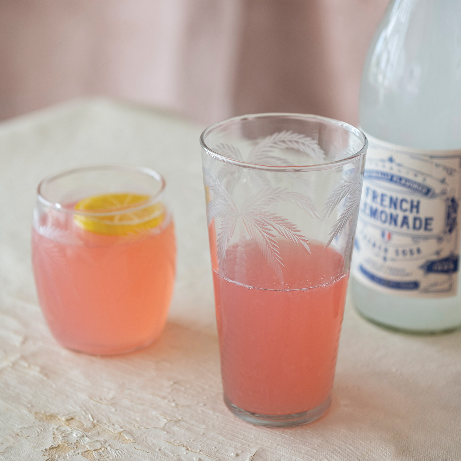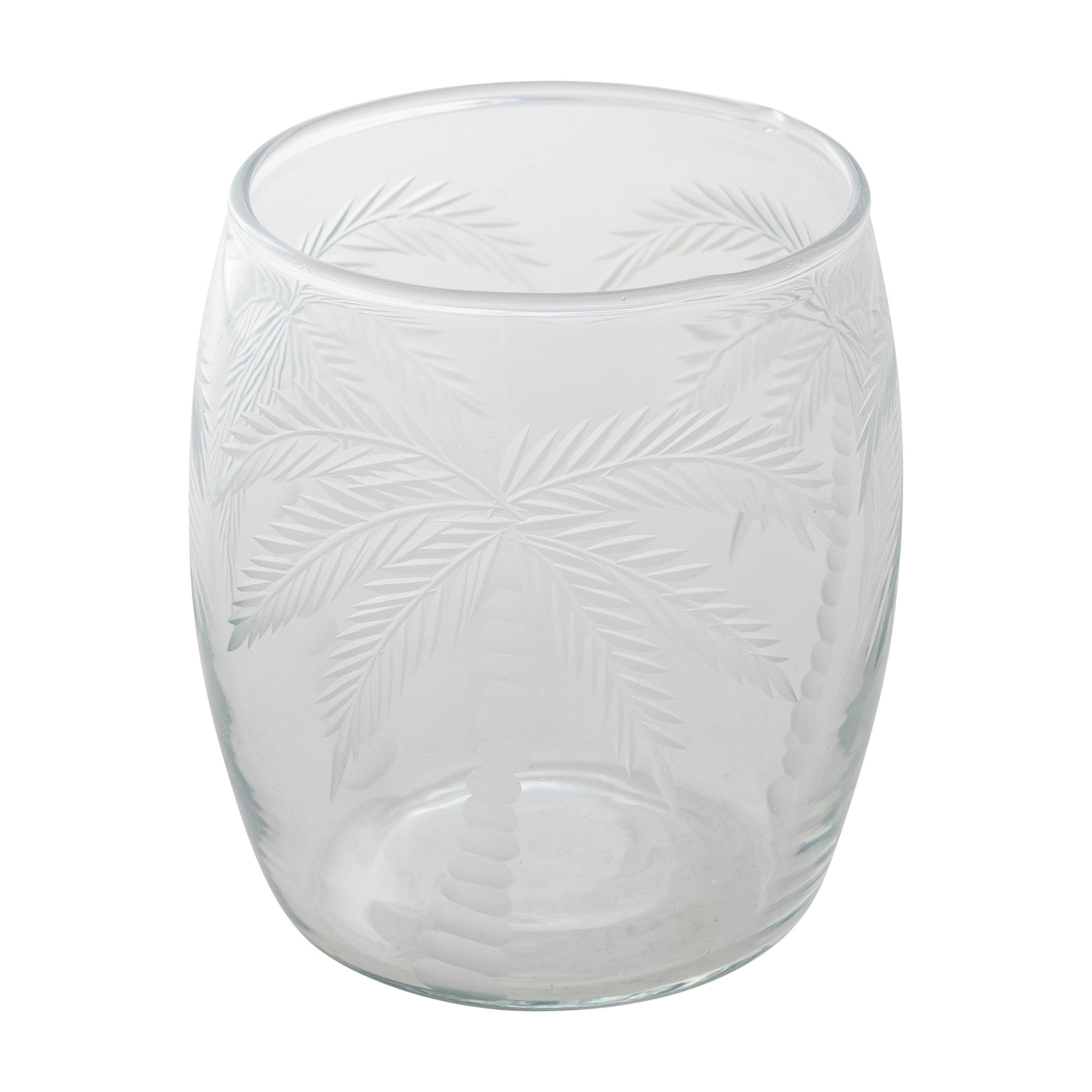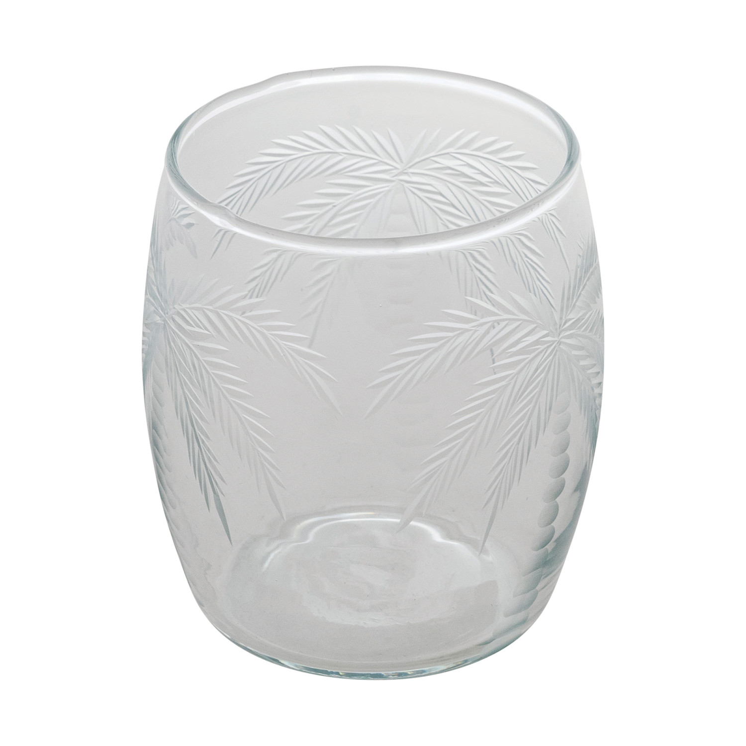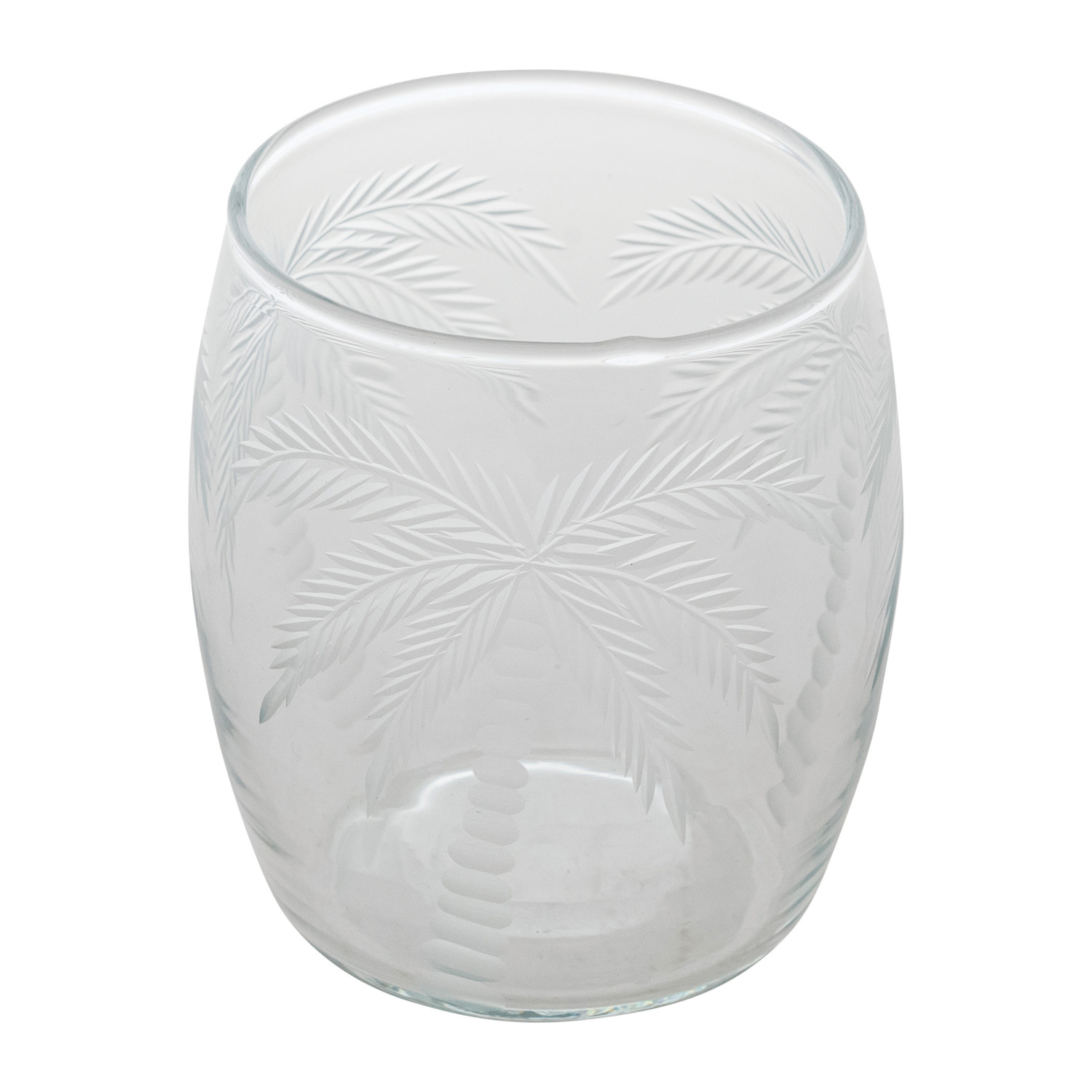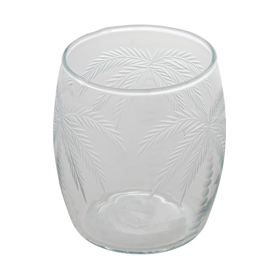Catalog Name: 3-1/4" Round x 3-1/4"H 8 oz. Etched Drinking Glass w/ Palm Trees