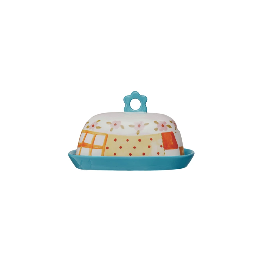 Catalog Name: 6-1/2"L x 4-1/2"W x 4-1/2"H Hand-Painted Stoneware Butter Dish w/ Pattern & Flower Shaped Handle, Multi Color