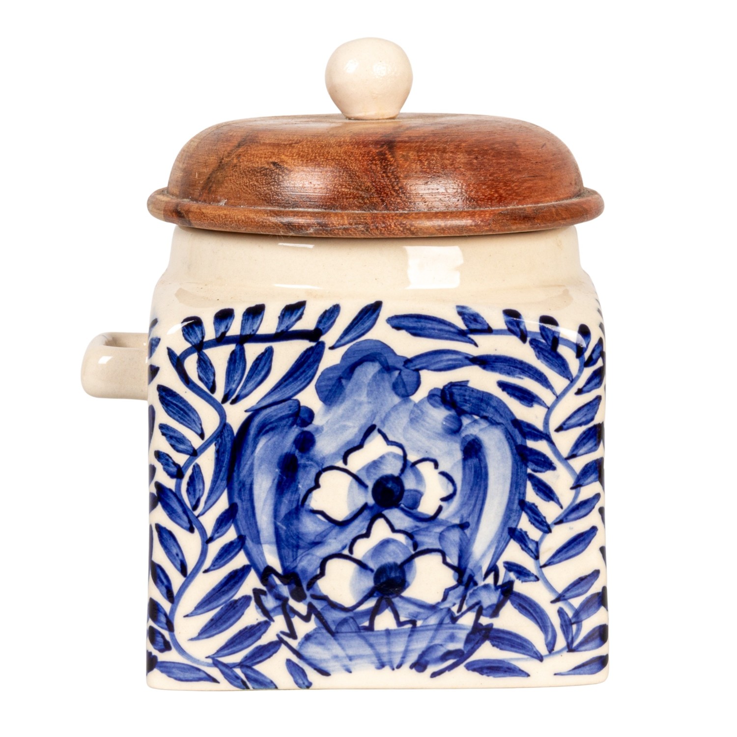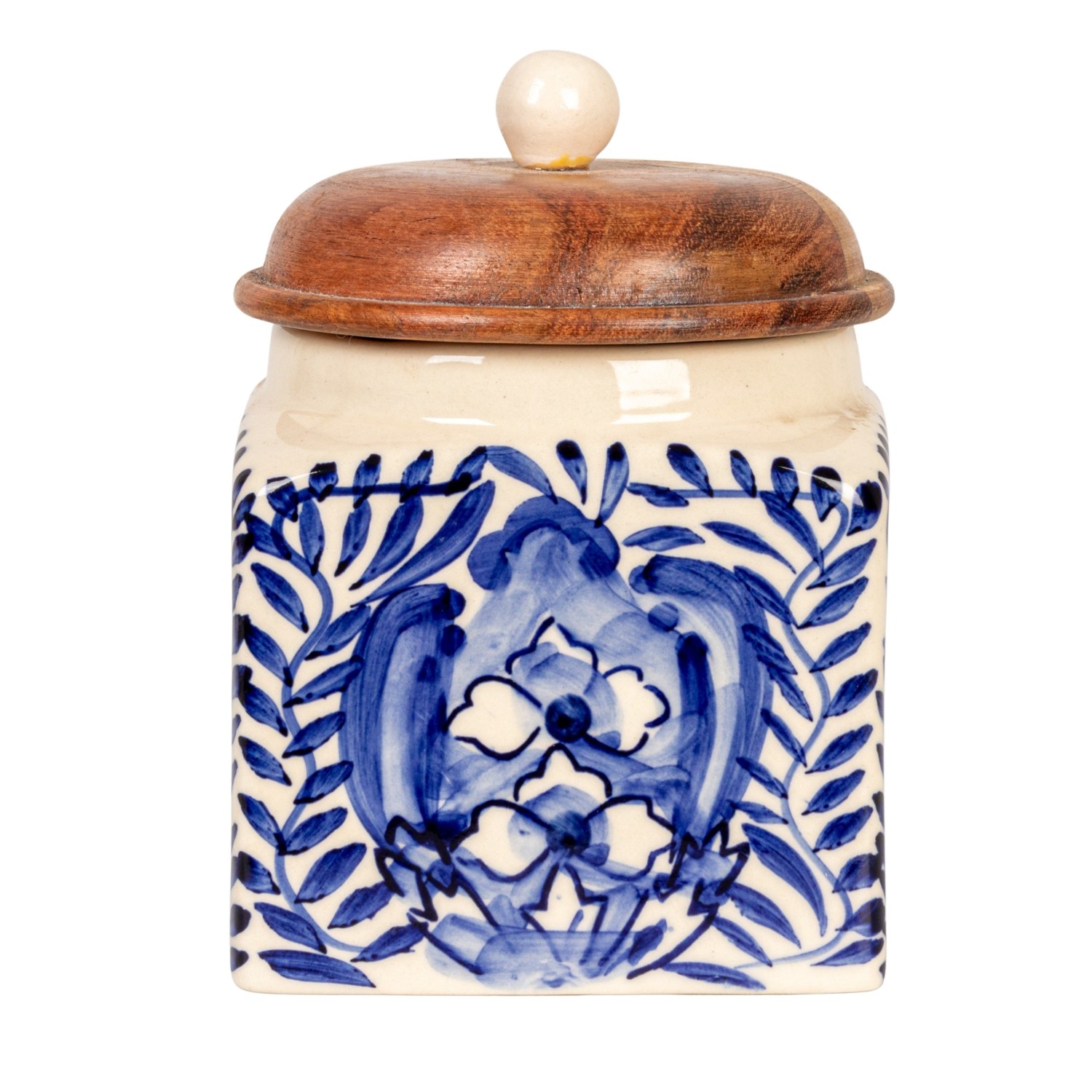 Catalog Name: 5"L x 4-1/4"W x 5-1/2"H Hand-Painted Stoneware Canister w/ Design, Acacia Wood Lid & Spoon, Cream Color, Blue & Natural, Set of 2