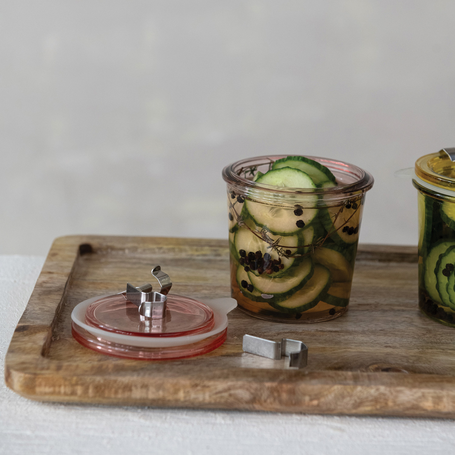 Catalog Name: 3-3/4" Round x 3-1/2"H Airtight Food Storage Jar w/ Lid, Rubber Seal & 3 Removable Metal Clamps, 4 Colors