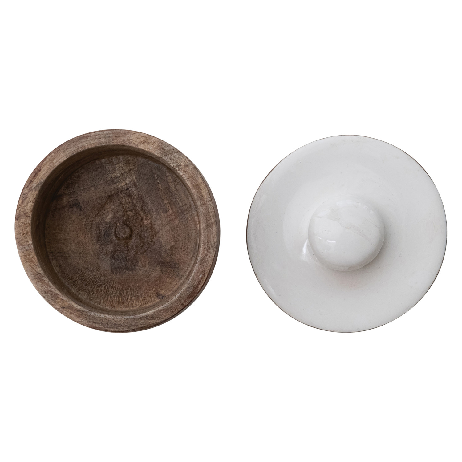 Catalog Name: 3" Round x 2-3/4"H Mango Wood Pinch Pot w/ Enameled Lid, Natural & White