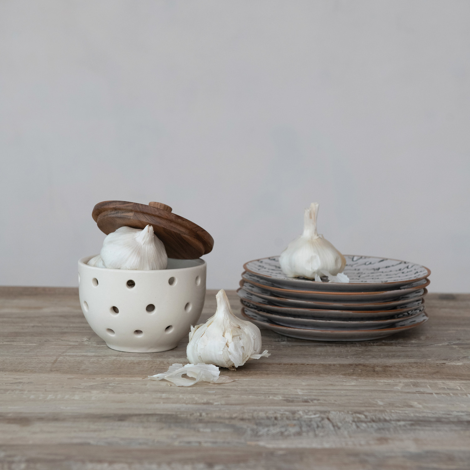 Catalog Name: 5" Round x 4-1/2"H Stoneware Garlic/Onion Keeper w/ Mango Wood Lid, Cream Color & Natural