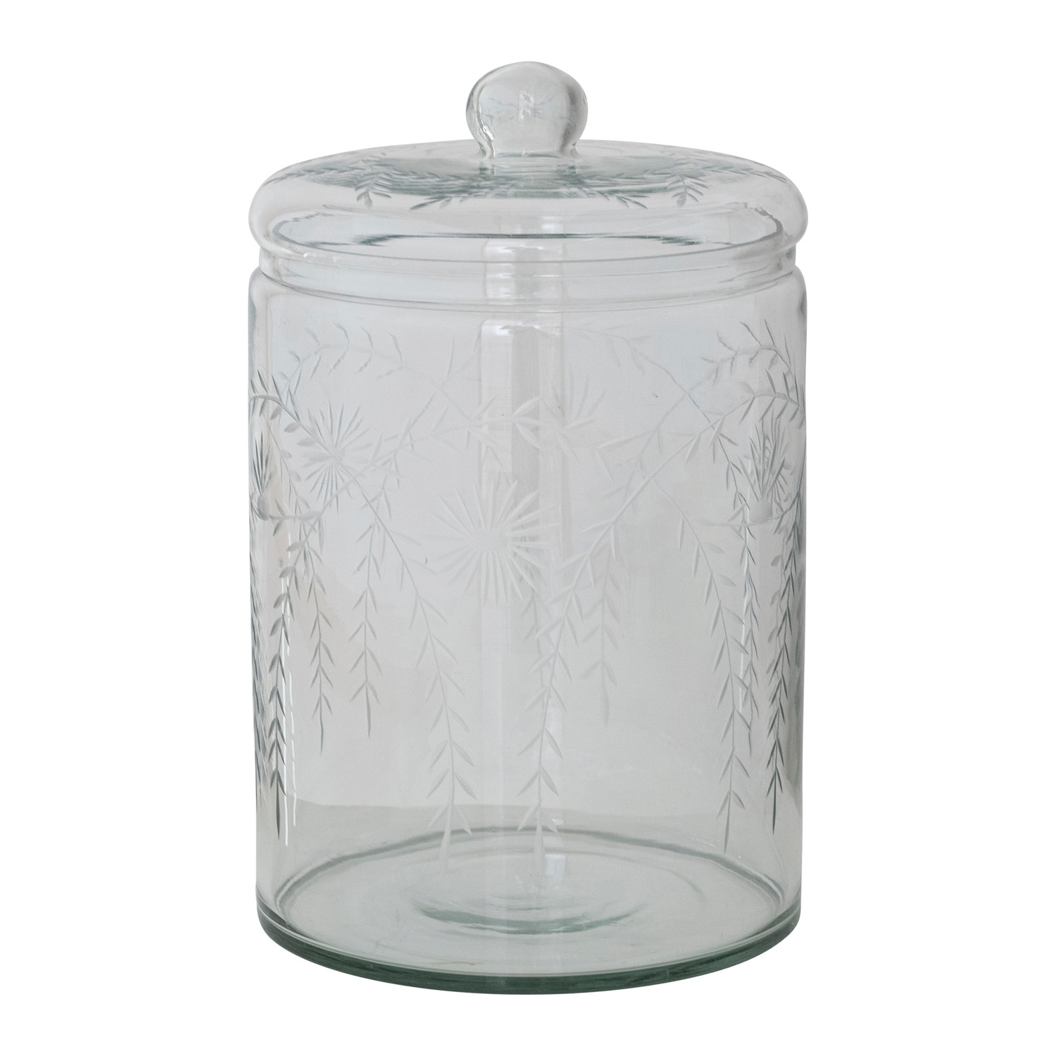 Catalog Name: 8" Round x 13"H 7-1/4 Quart Hand-Blown Glass Jar w/ Etched Botanicals & Lid