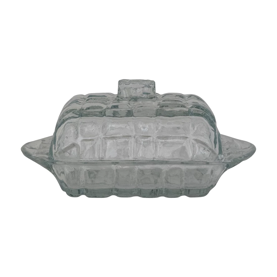 6-3/4"L x 4"W x 3"H Pressed Glass Butter Dish with Grid Pattern