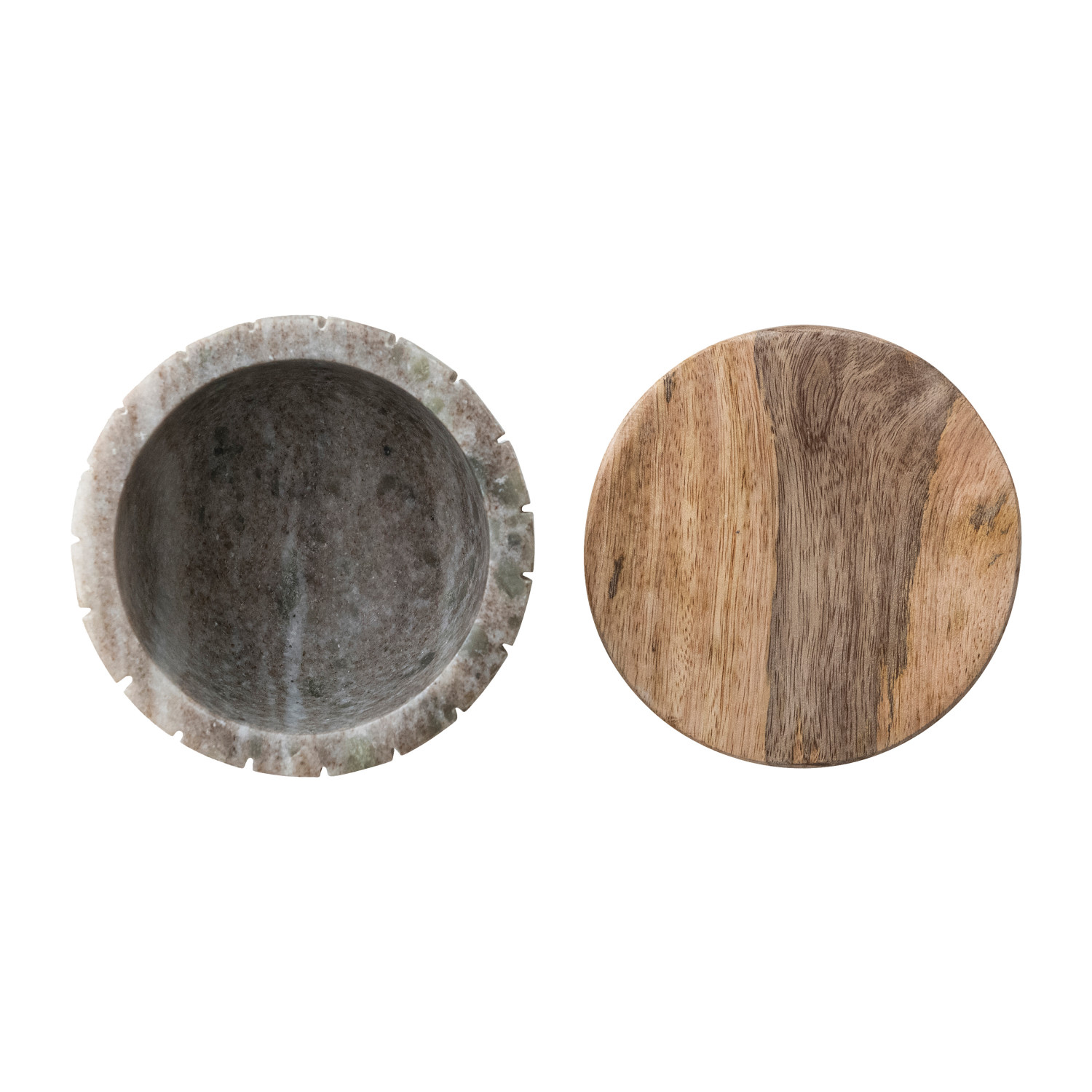 Catalog Name: 4" Round x 3-1/2"H Carved Marble Container w/ Mango Wood Lid, Brown & Natural