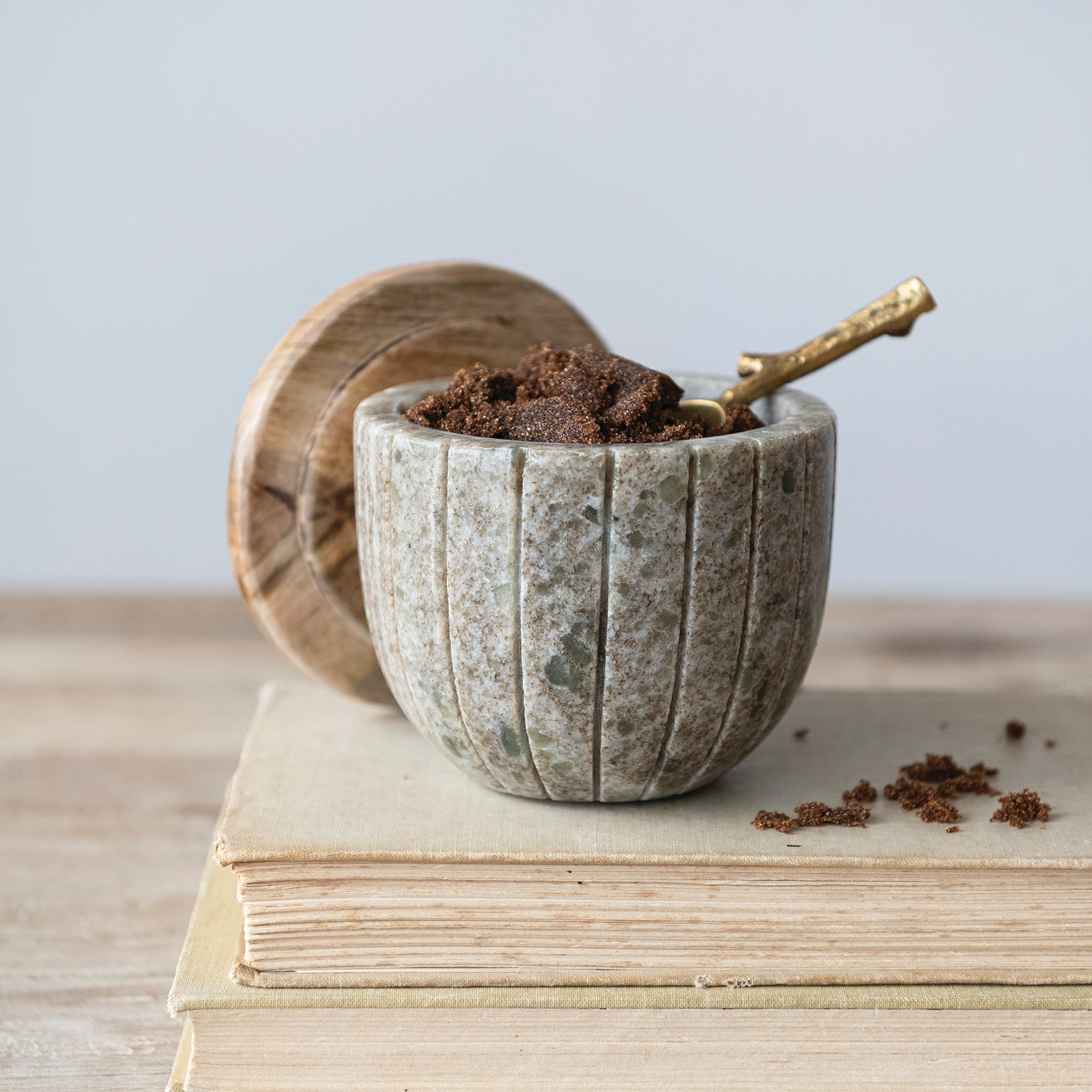 Carved Marble Container with Mango Wood Lid, Brown & Natural
