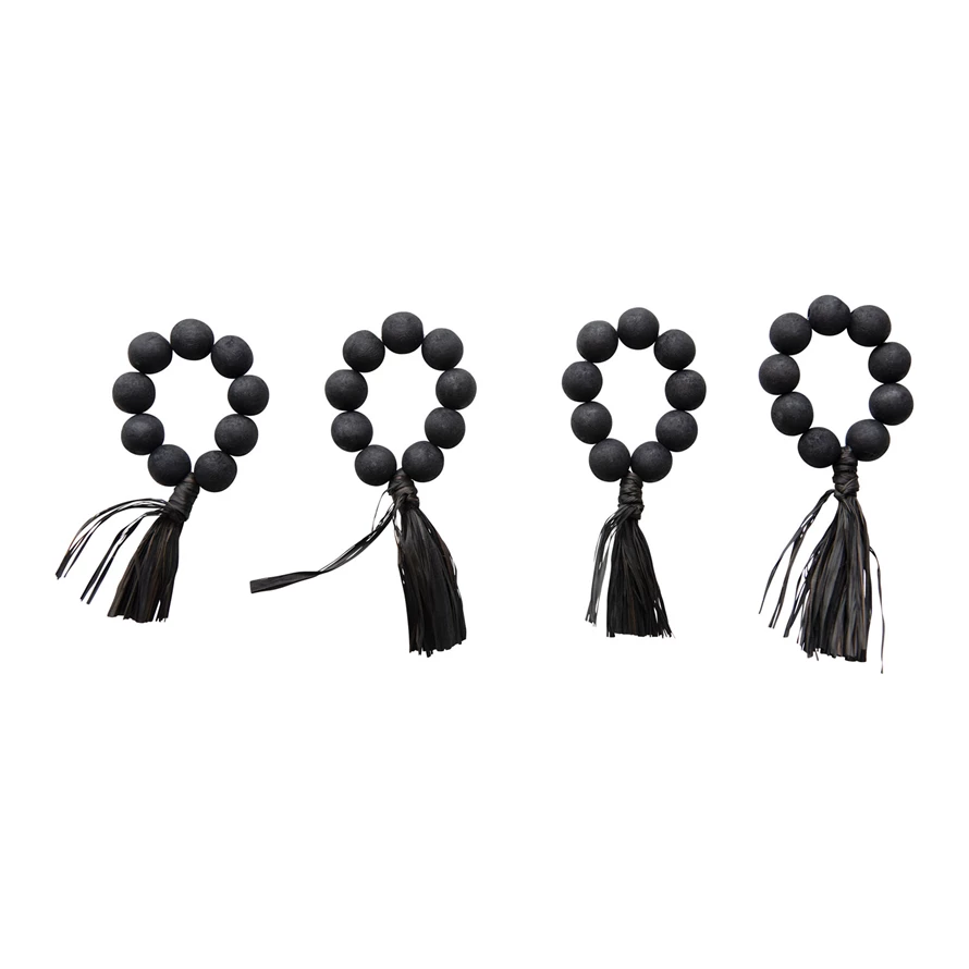 Catalog Name: 2-1/4" Round Wood Bead Napkin Rings w/ Raffia Tassel, Black, Set of 4