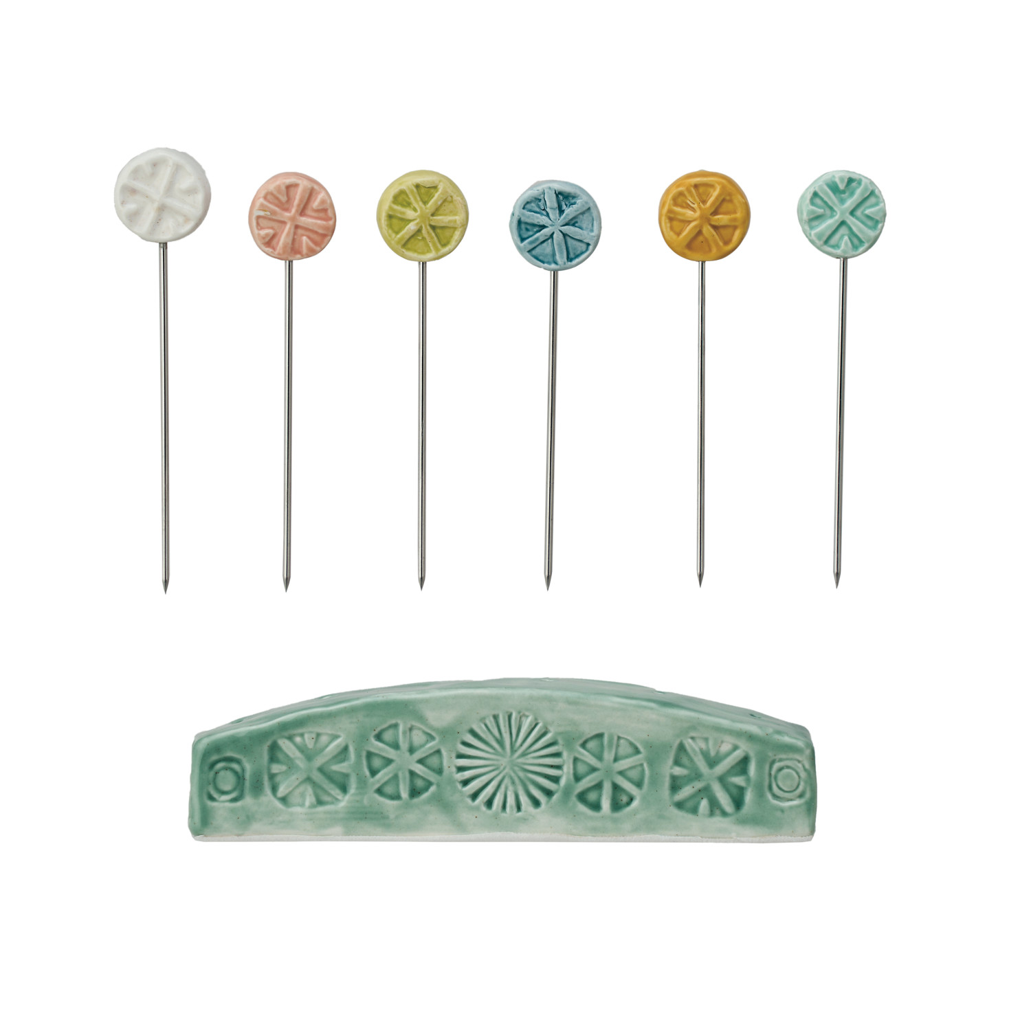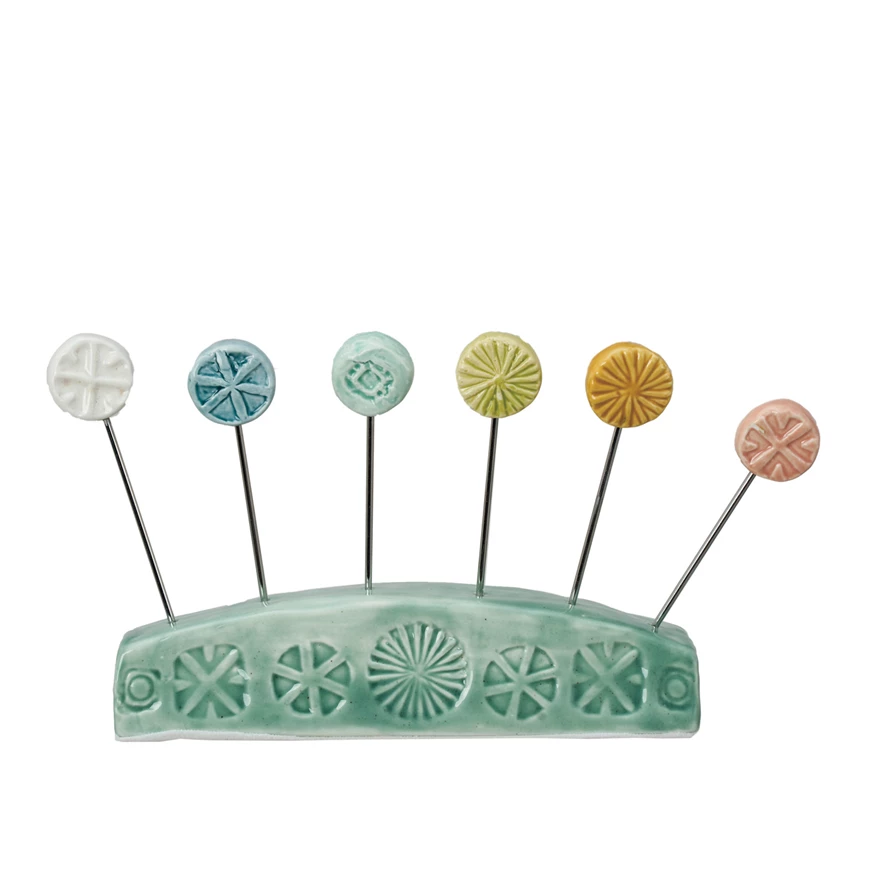 Hand-Painted Debossed Stoneware Appetizer Picks w/ Holder, Set of 7 ©