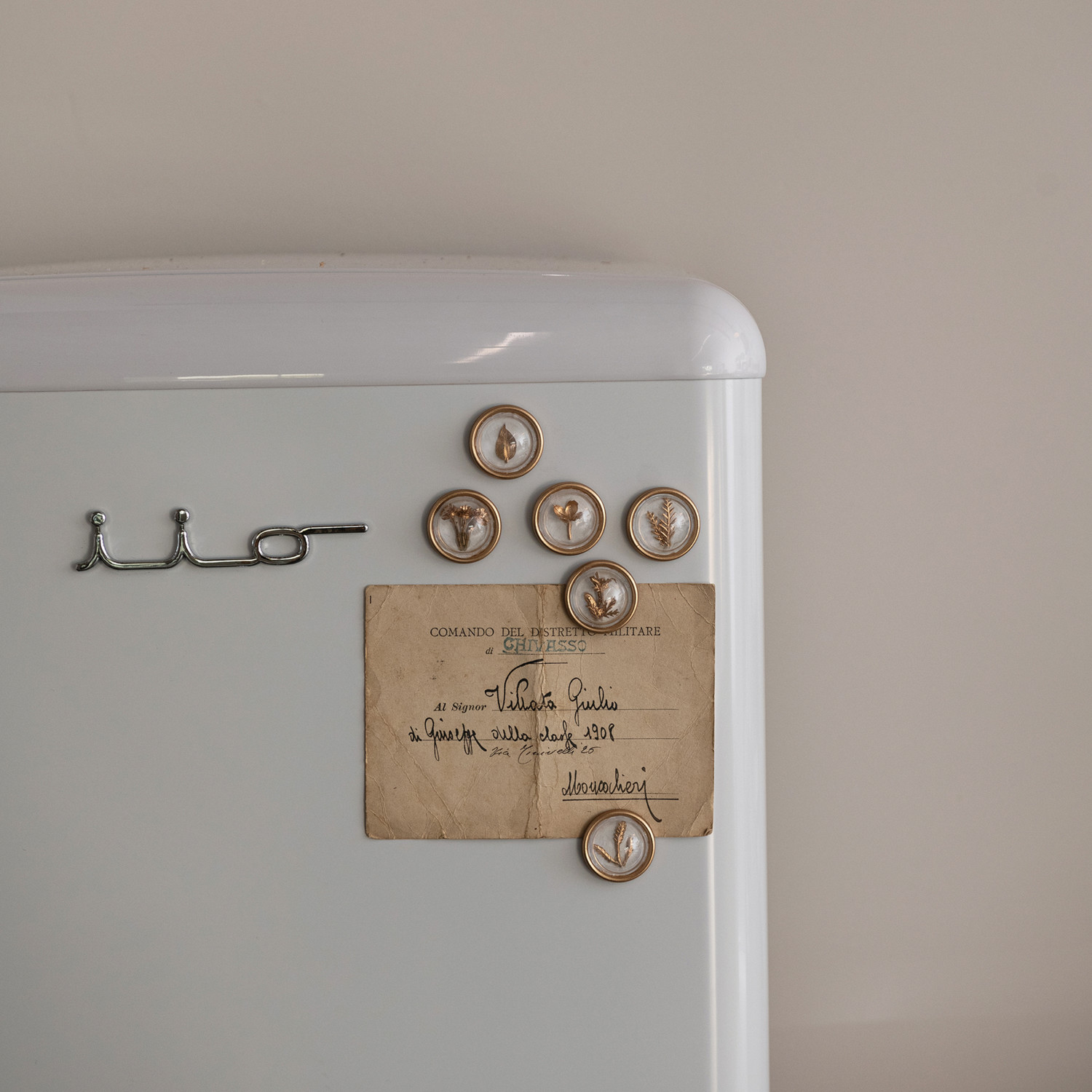 Catalog Name: 1" Round Resin Convex Magnets on Metal Card w/ Botanicals, Gold Finish, Set of 6