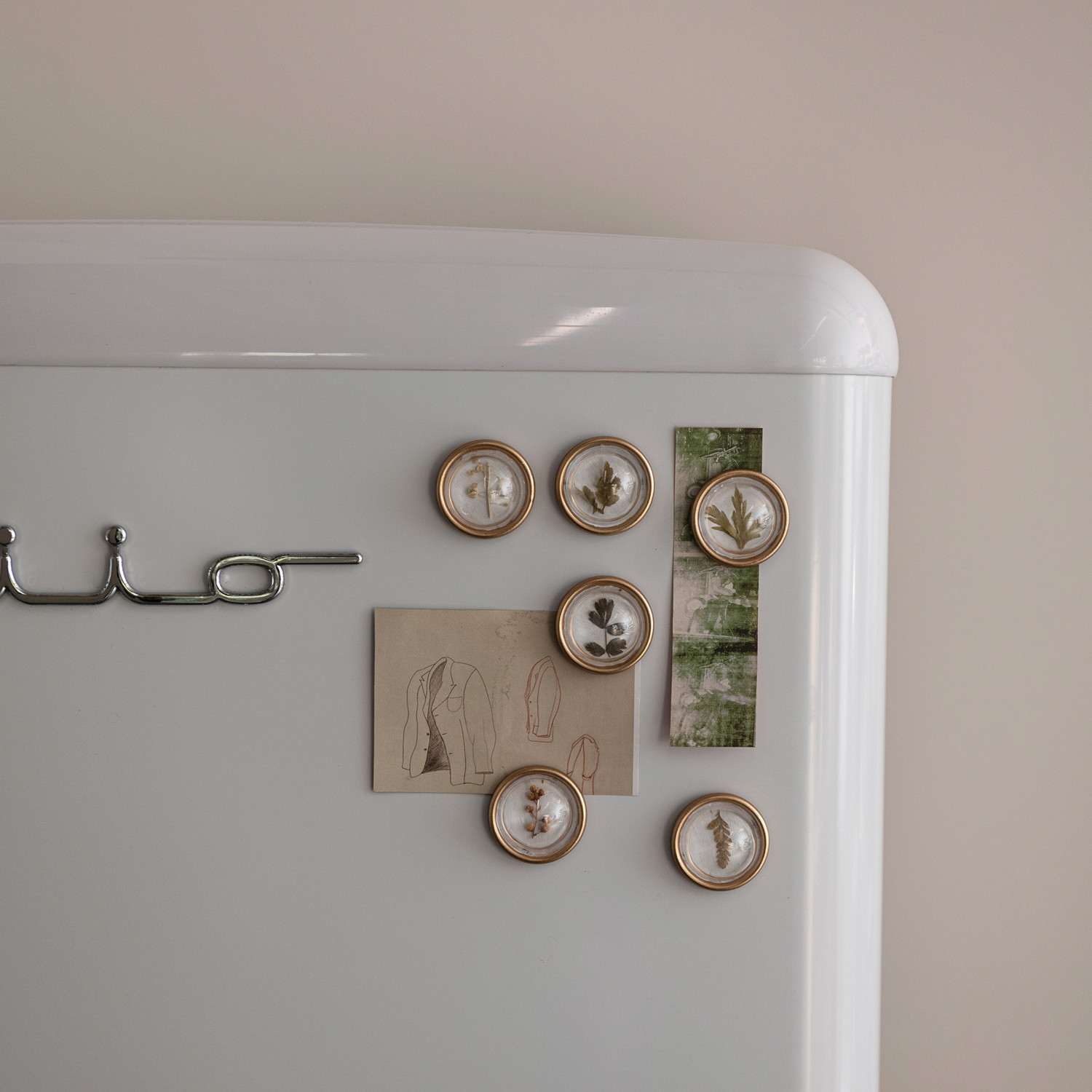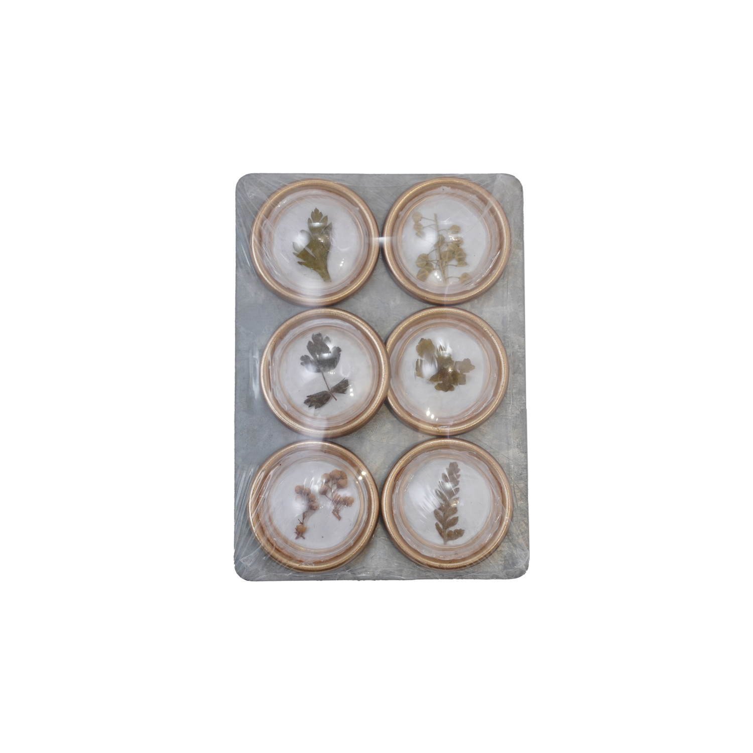 Catalog Name: 1" Round Resin Convex Magnets on Metal Card w/ Dried Botanicals, Gold Finish & Natural, Set of 6