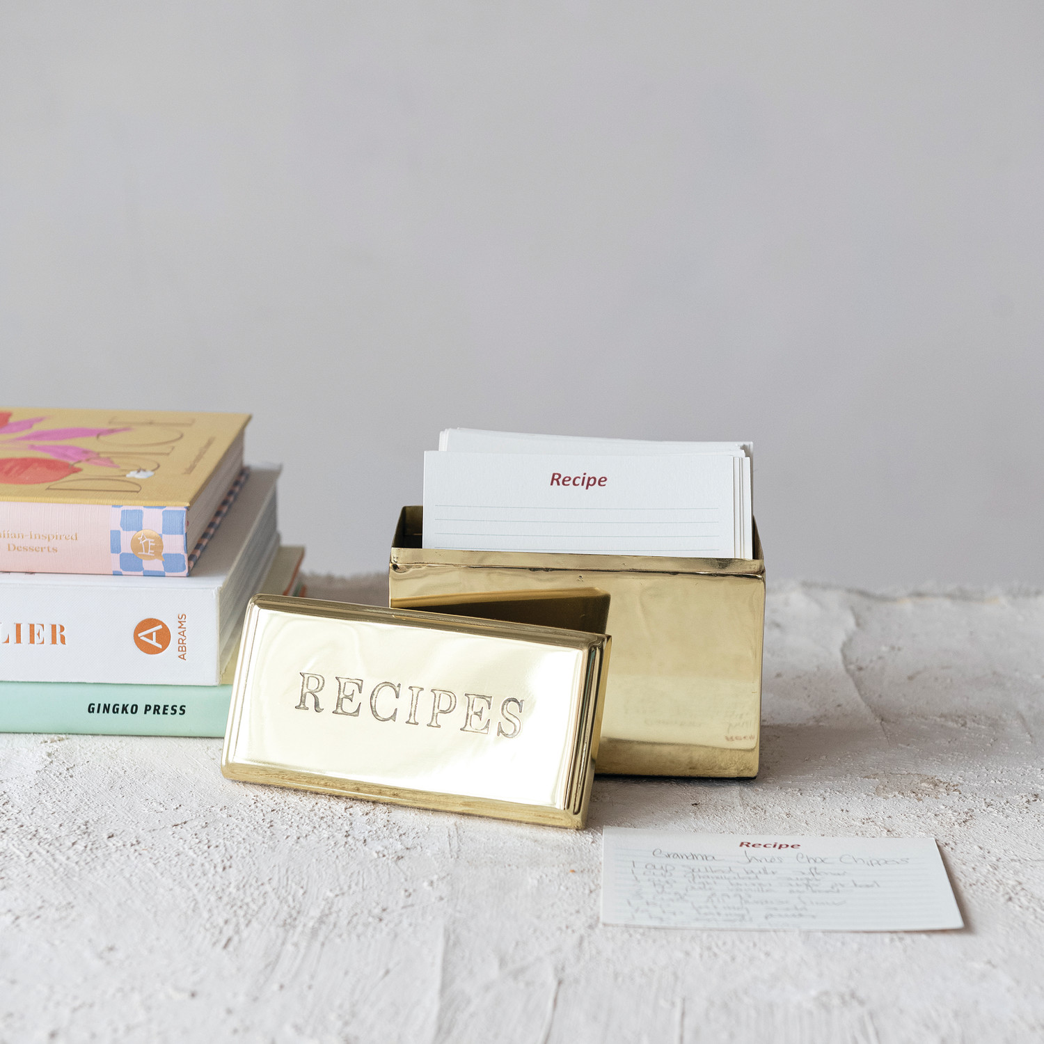 Etched Stainless Steel "Recipes" Box with 36 Recipe Cards, Gold Finish, Set of 37