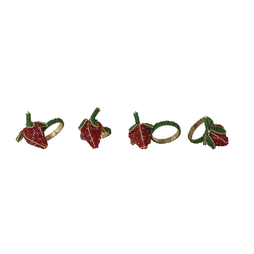 Handmade Glass Beaded Strawberry Napkin Rings, Set of 4 Tied with Gold Cord