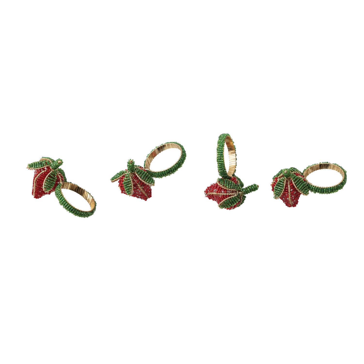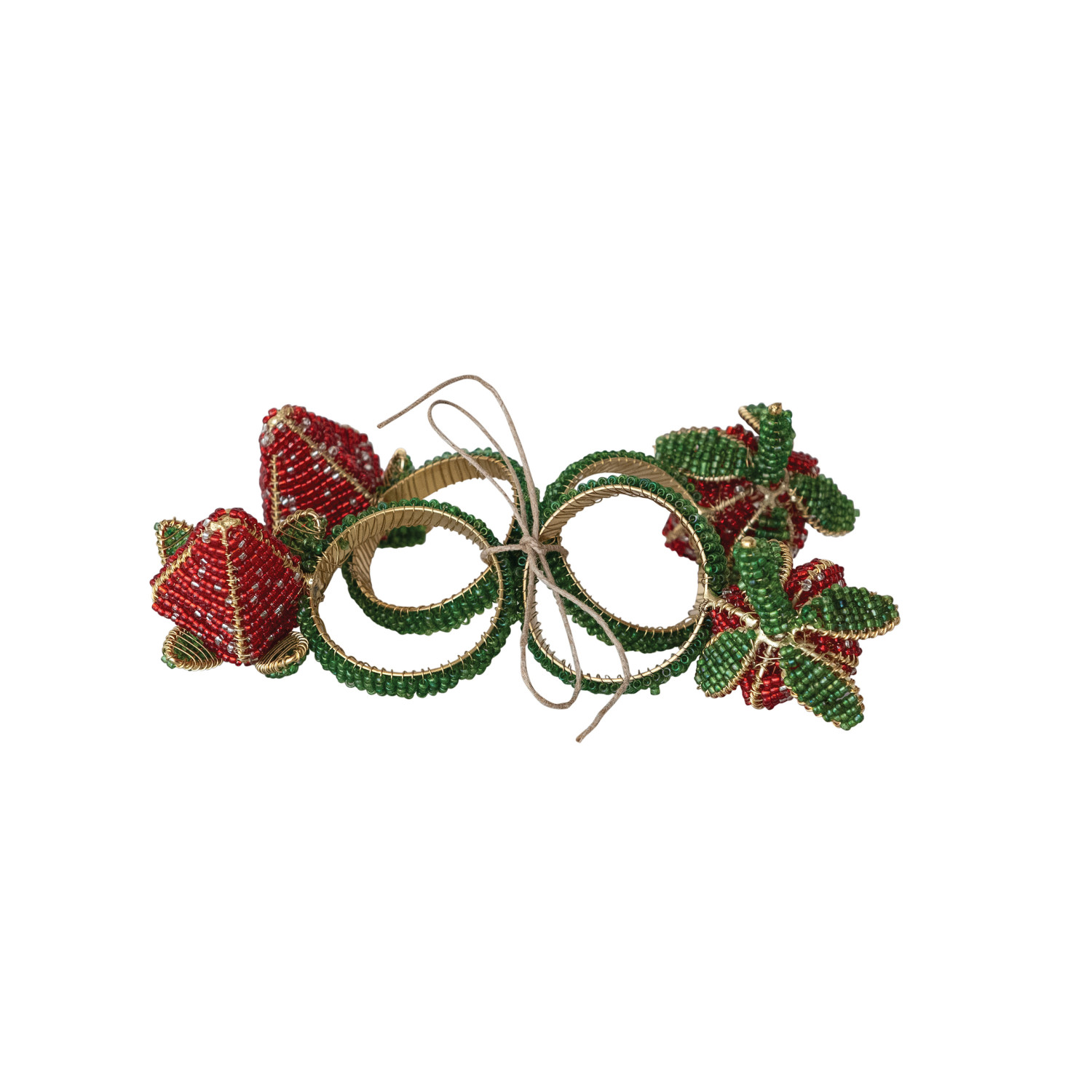 Catalog Name: 3" Round Handmade Glass Beaded Strawberry Napkin Rings, Red, Green & Gold Finish, Set of 4 Tied w/ Gold Cord