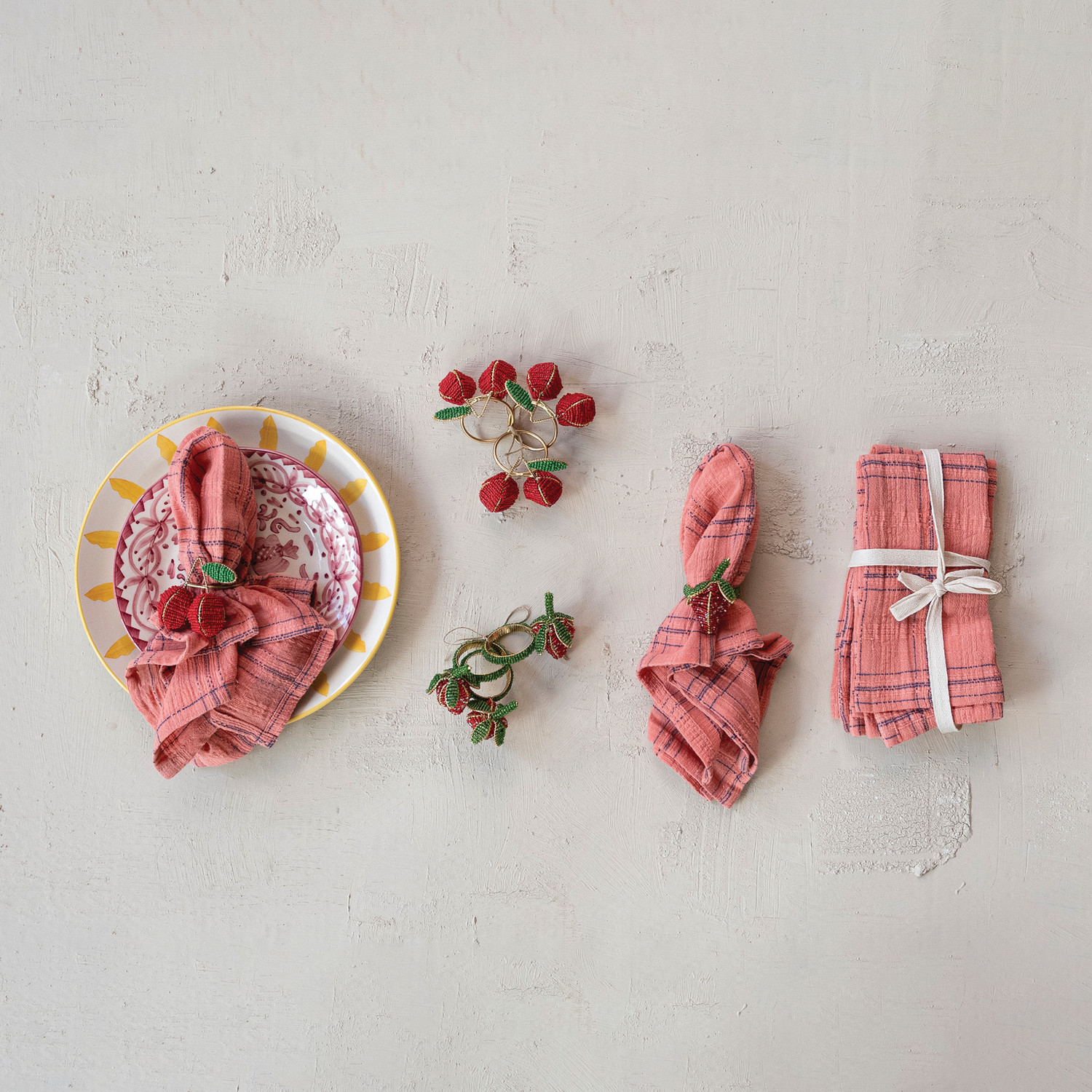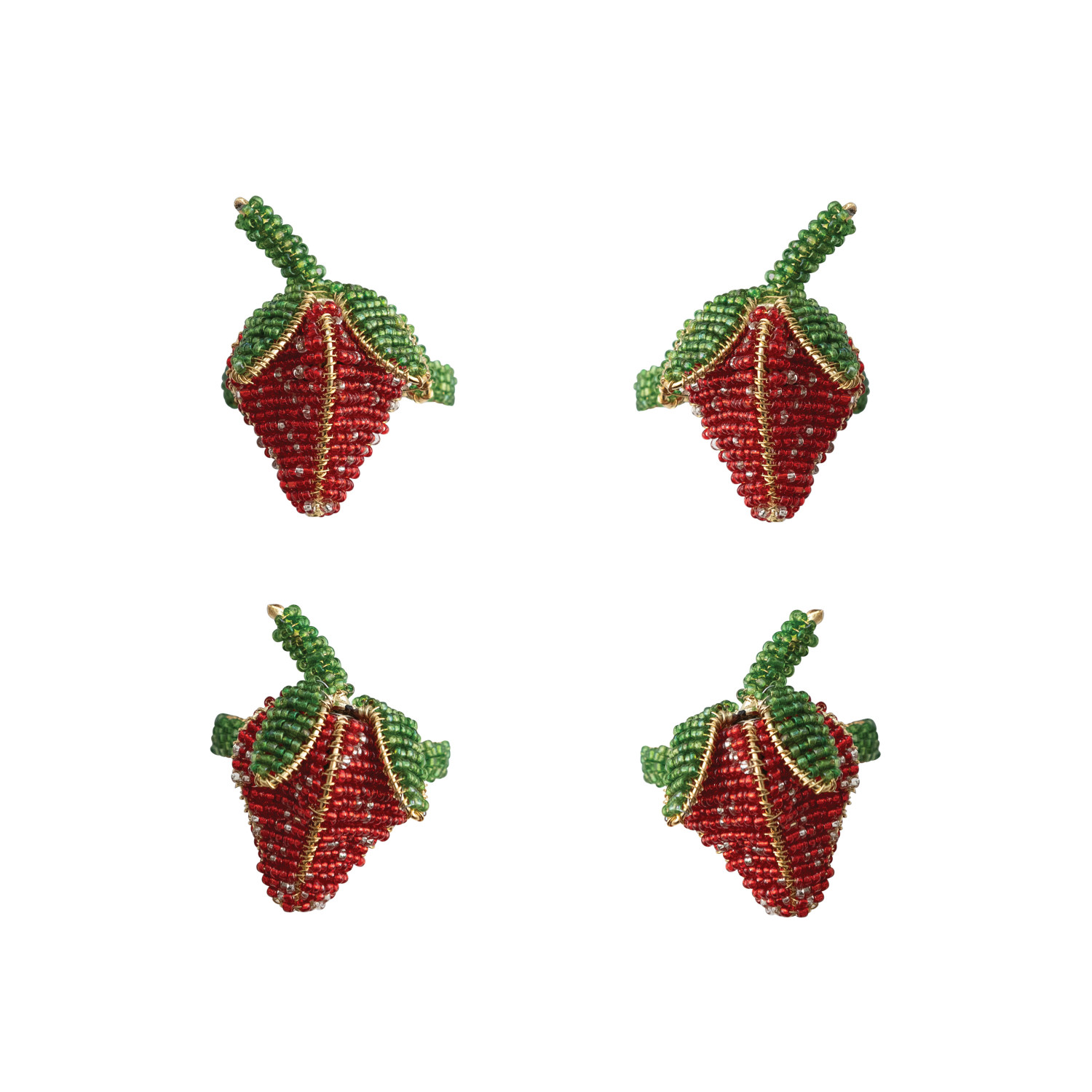 Handmade Glass Beaded Strawberry Napkin Rings, Set of 4 Tied with Gold Cord