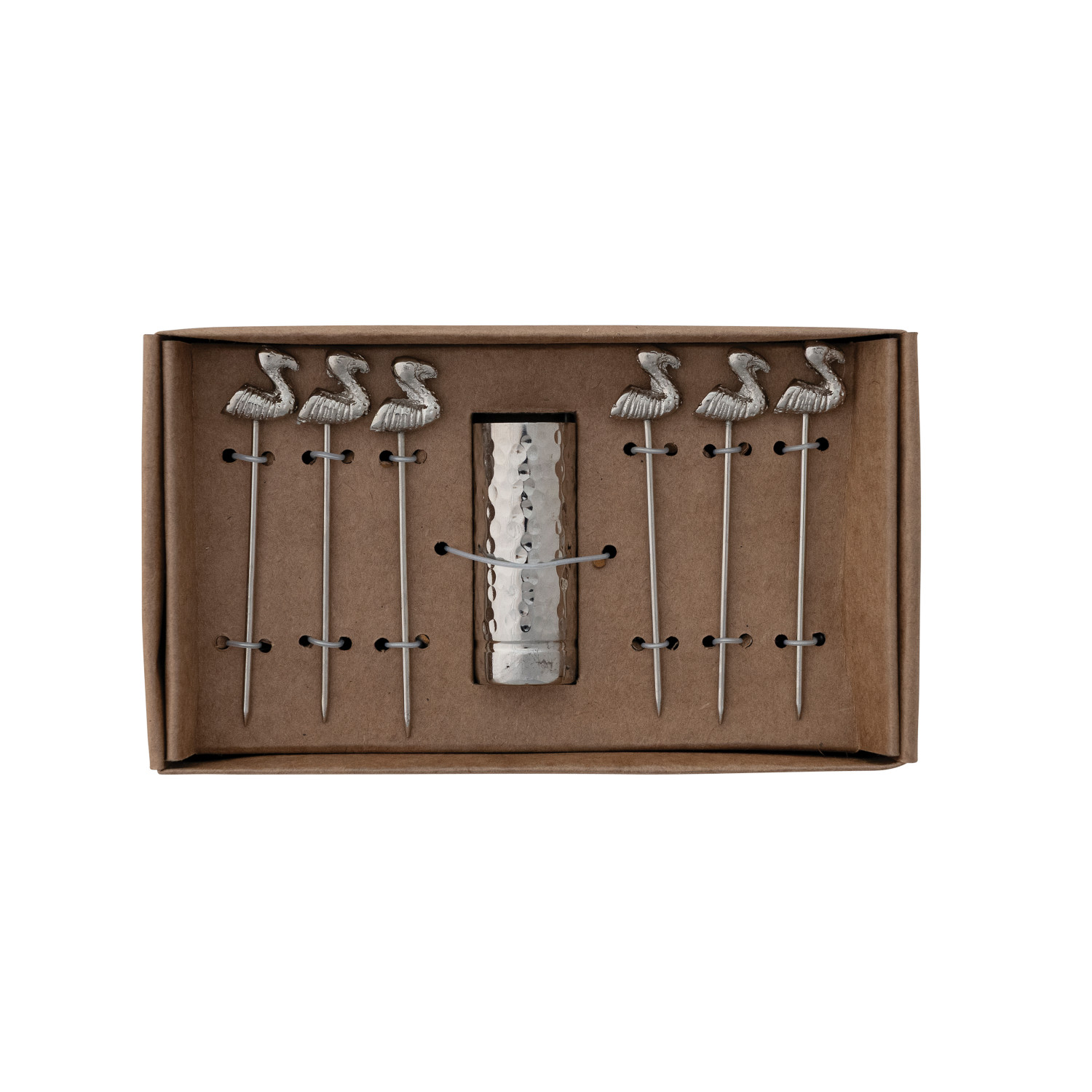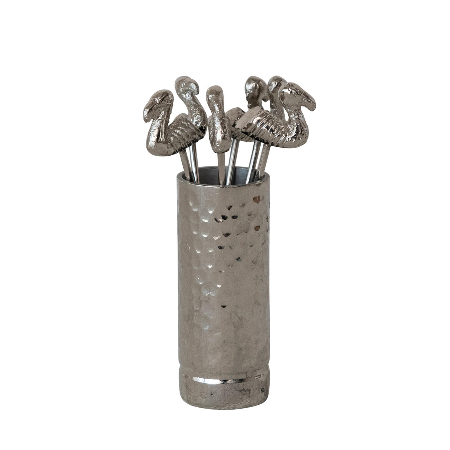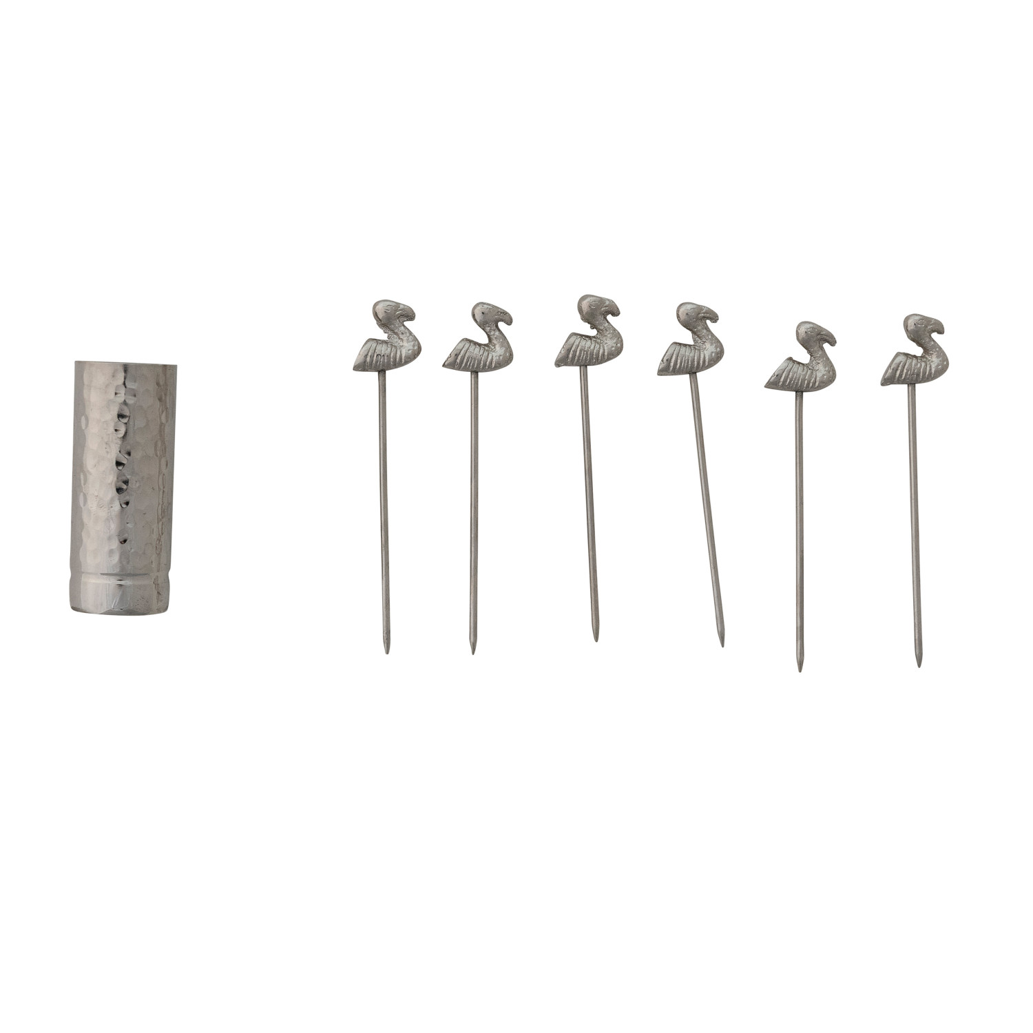 Catalog Name: 1" Round x 2-1/2"H Aluminum Holder w/ (6) 3-1/2"L Stainless Steel Appetizer Picks w/ Flamingo Handles, Boxed Set of 7