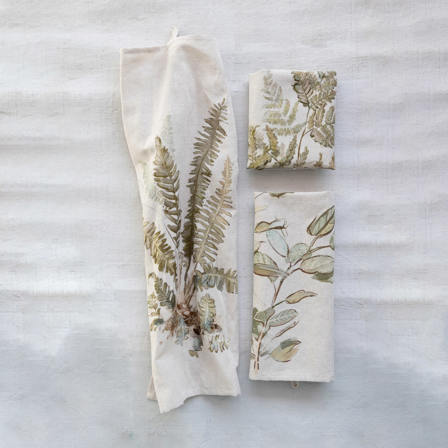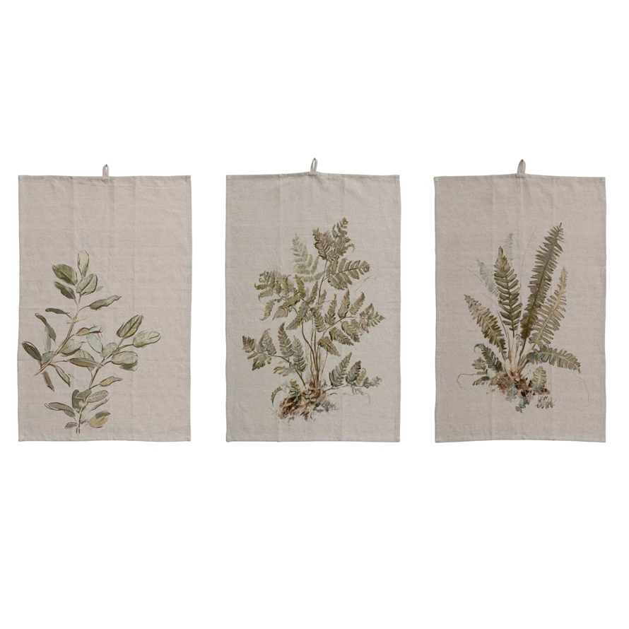 Catalog Name: 28"L x 18"W Printed Cotton & Linen Tea Towel w/ Botanical Image, Natural & Green, 3 Styles ©