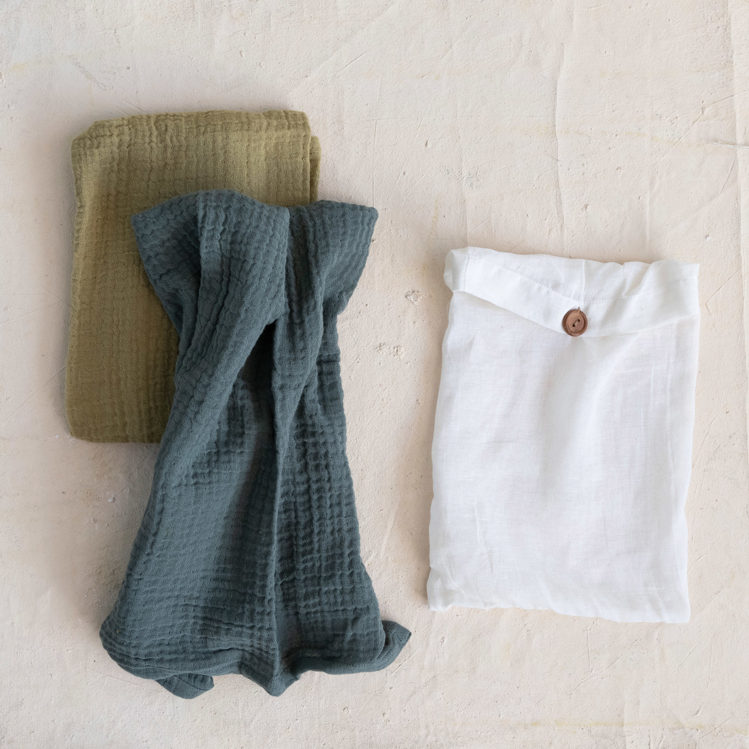 This elegant set of cotton tea towels features 2 timeless hues and a stylish storage bag. Machine Wash Warm, Gentle Cycle, Do Not Bleach, Tumble Dry Low, Warm Iron if Needed.