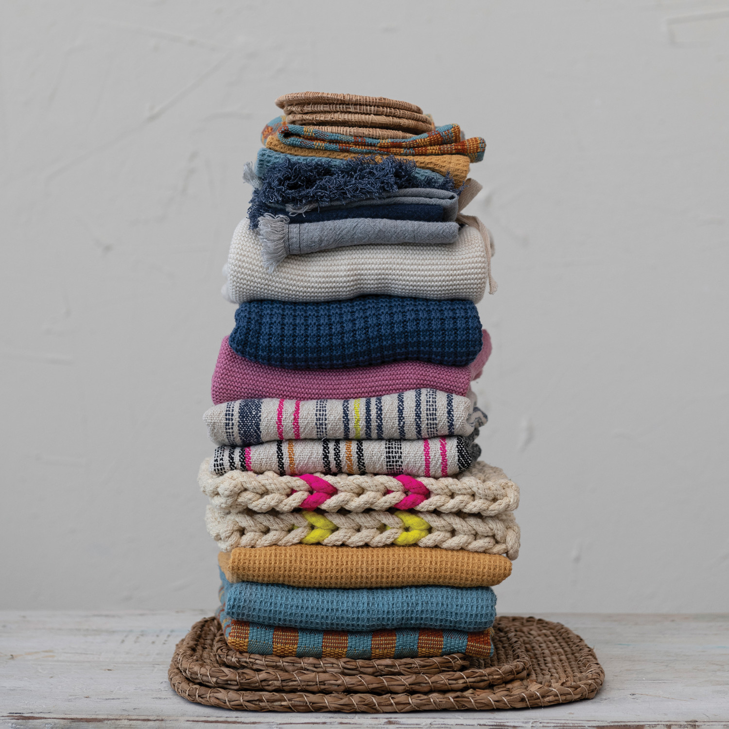 Featuring a vast selection of lush woven textures, intricate details, and timeless patterns, our collection of kitchen textiles will bring warmth and elegance to a dining space of any style. Instantly transform a breakfast nook or dining room into a sophisticated sanctuary by exploring a vast array of textiles and accessories fit for any space including table runners, napkin sets, placemats, napkin rings, tea towels, dish cloths, sponge cloths, pot holders, food pouches, aprons, and so much more. Choose from a wide variety of luxurious fabrics from cotton and velvet to linen and seagrass, and styles from mid-century modern and boho to classic farmhouse and contemporary. This essential set of cotton knit tea towels features hanging loops and 3 versatile hues. Display in a living or dining space of any style from farmhouse to cottage. Machine Wash Warm, Gentle Cycle, Do Not Bleach, Tumble Dry Low, Warm Iron If Needed. Made from cotton.