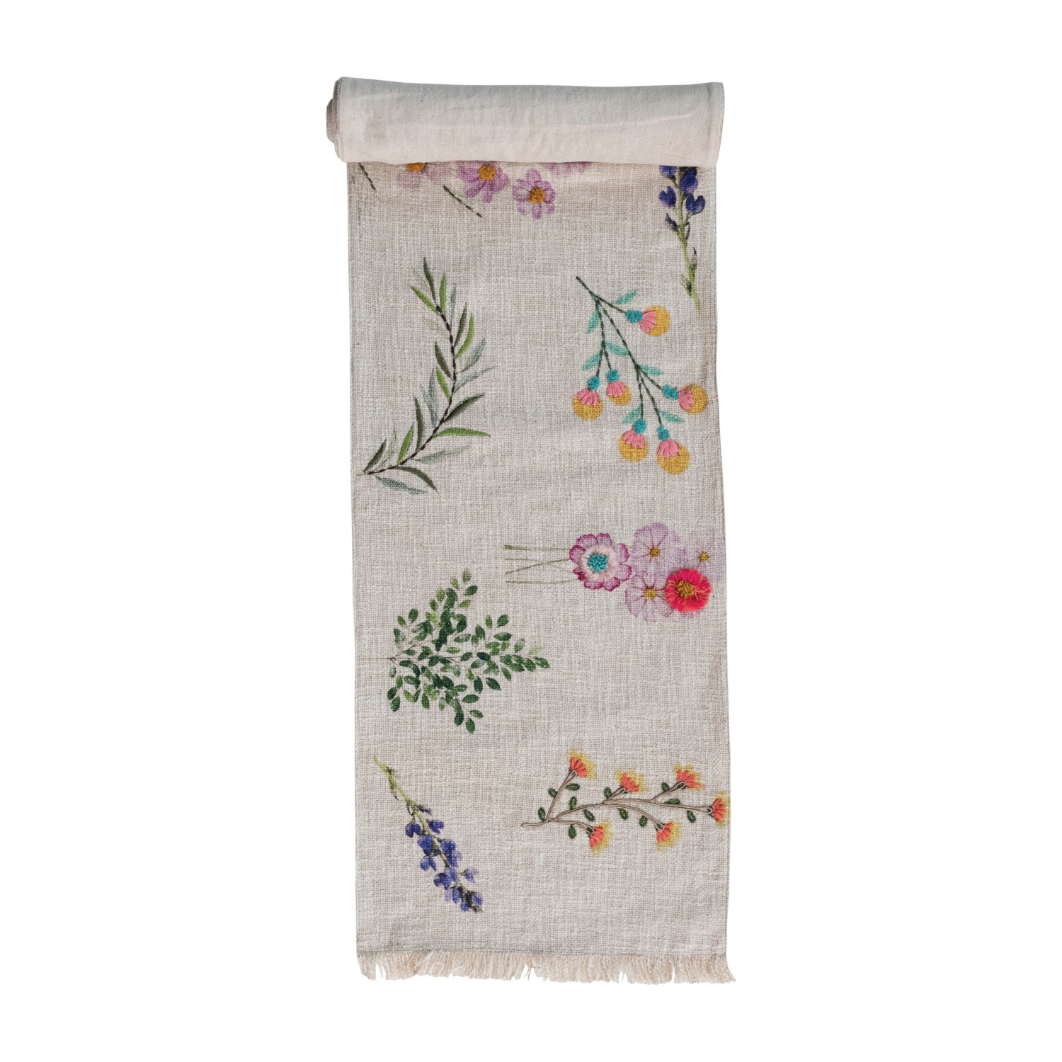Catalog Name: 72"L x 14"W Cotton Slub Printed Table Runner w/ Embroidered Flowers & Fringe, Multi Color