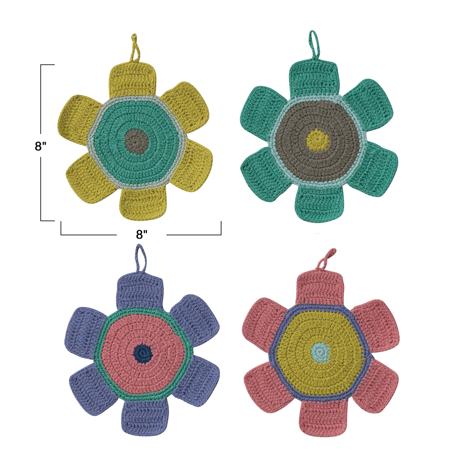 Catalog Name: 8" Round Cotton Crocheted Flower Shaped Pot Holder, Multi Color, 4 Styles