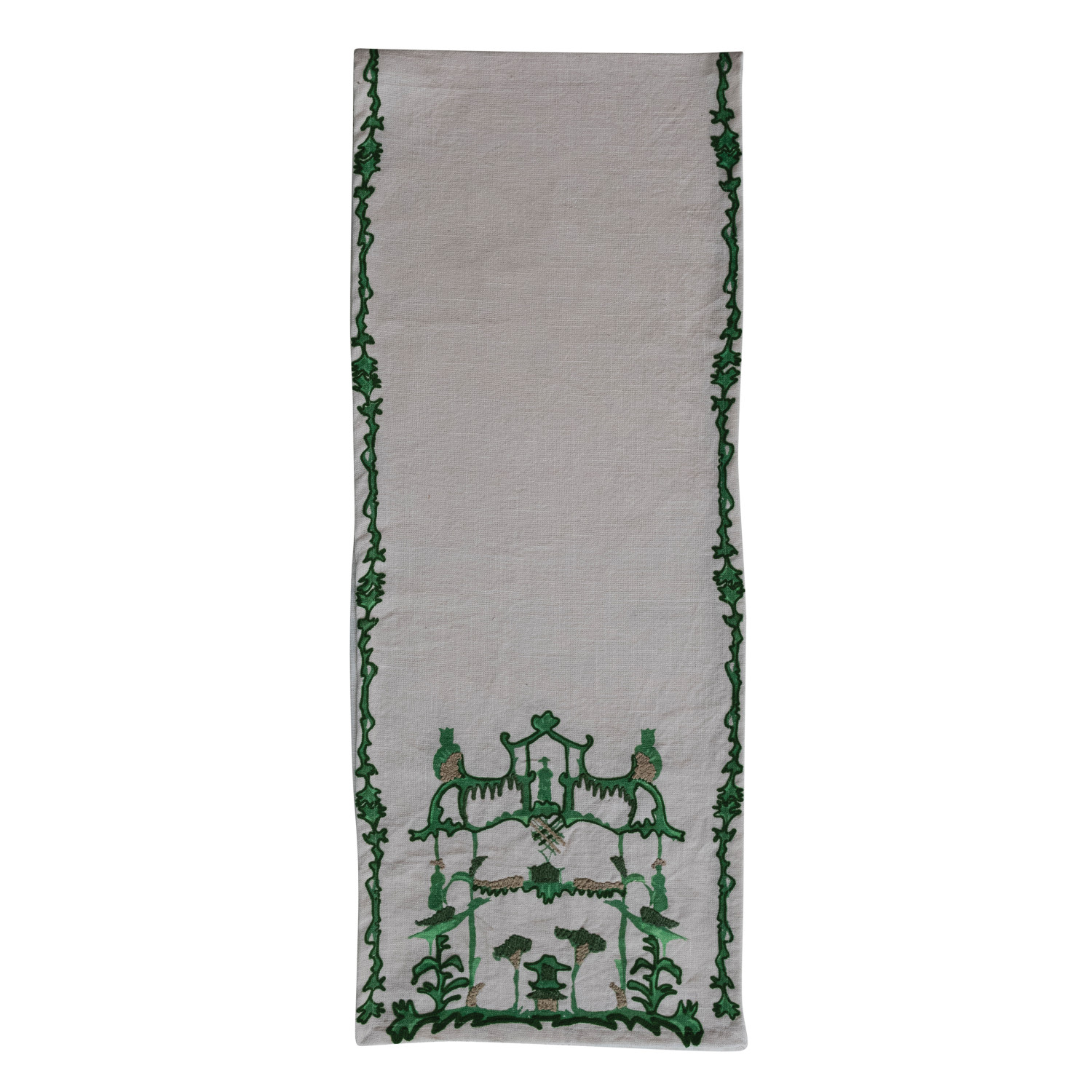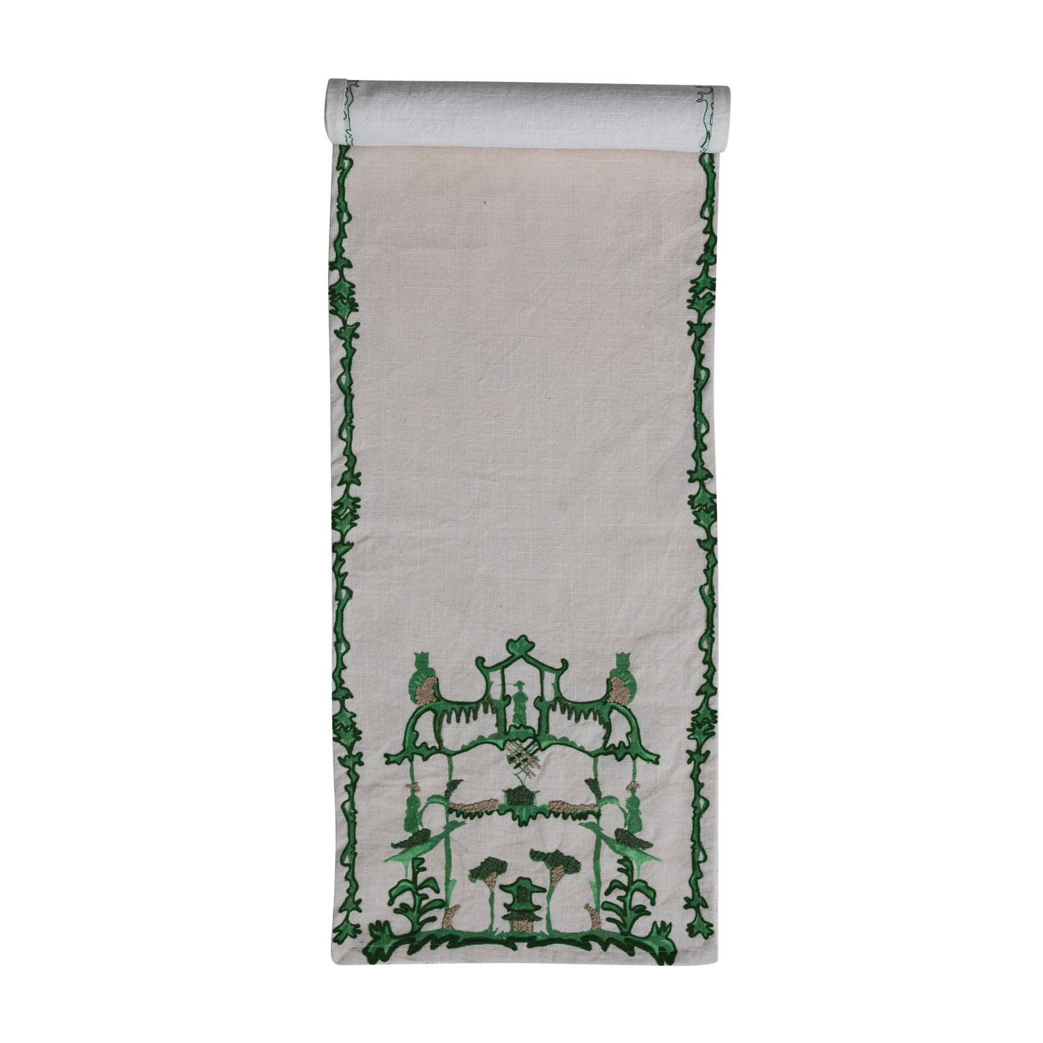 Woven Cotton Slub Table Runner with Embroidery, Cream Color & Green