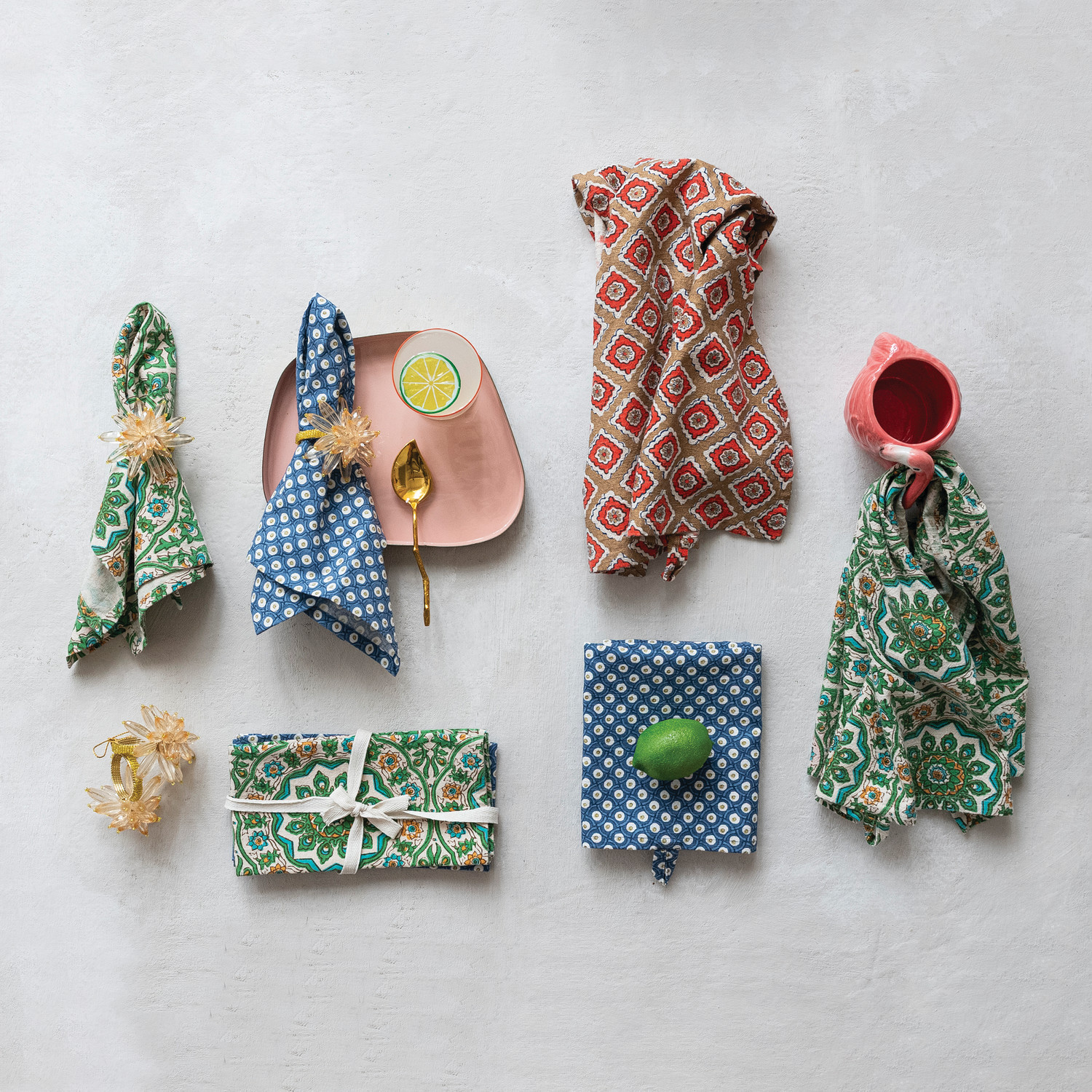 Cotton Napkins with Block Print Patterns, Set of 4 Tied with Cotton Tape