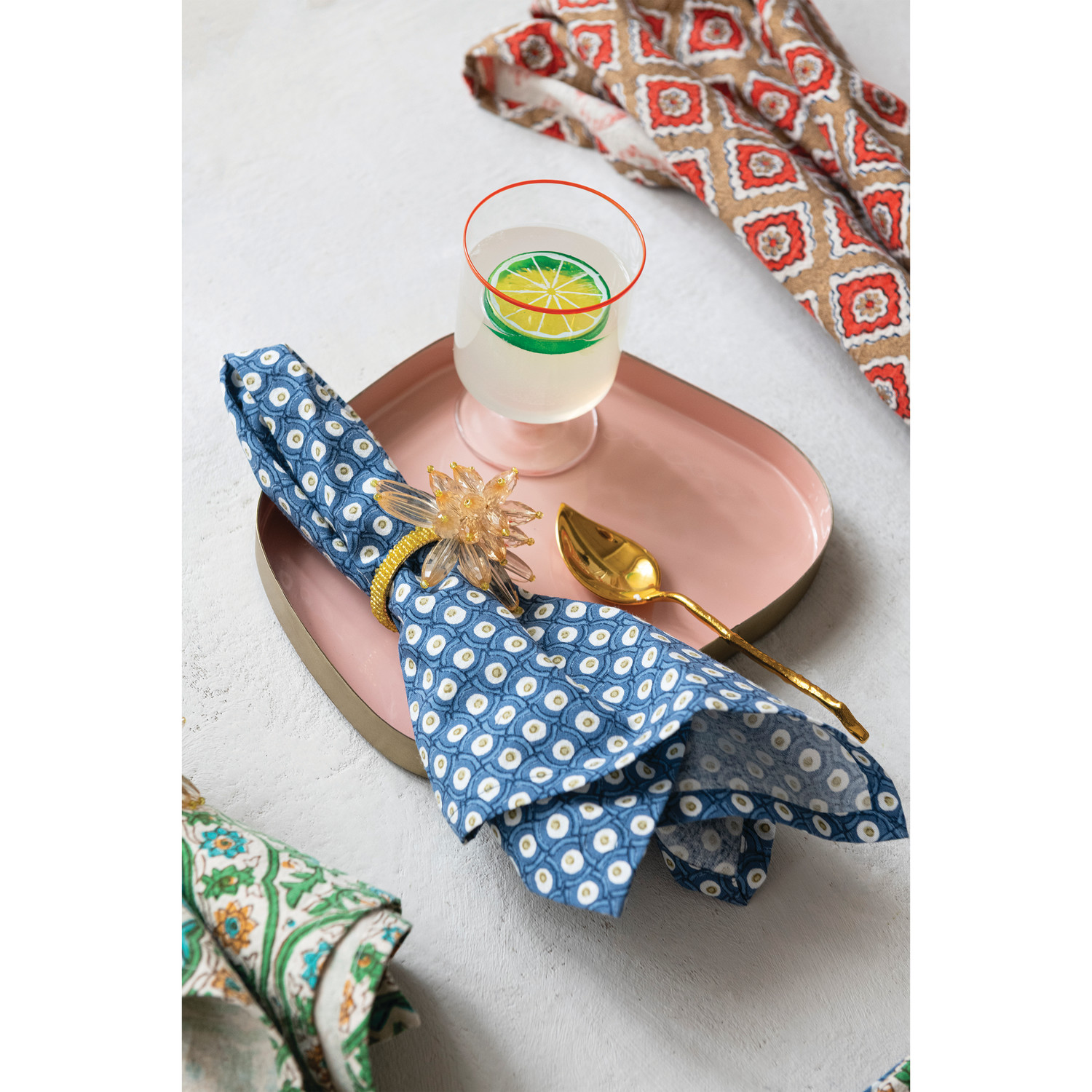 Catalog Name: 18" Square Cotton Printed Napkins w/ Block Print Patterns, Multi Color, Set of 4 Tied w/ Cotton Tape
