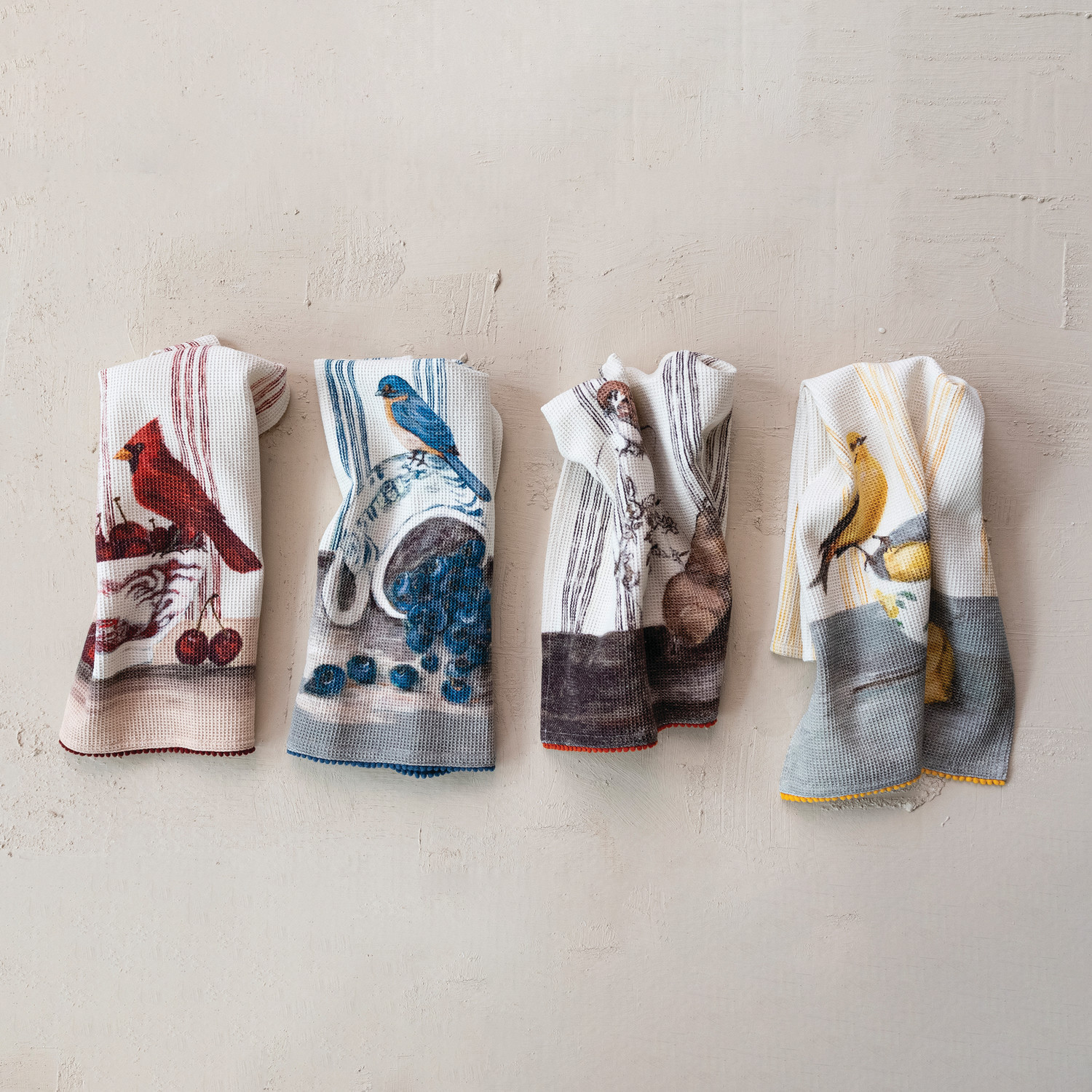Cotton Waffle Weave Tea Towel with Bird on Dish & Pom Pom Trim, 4 Styles ©