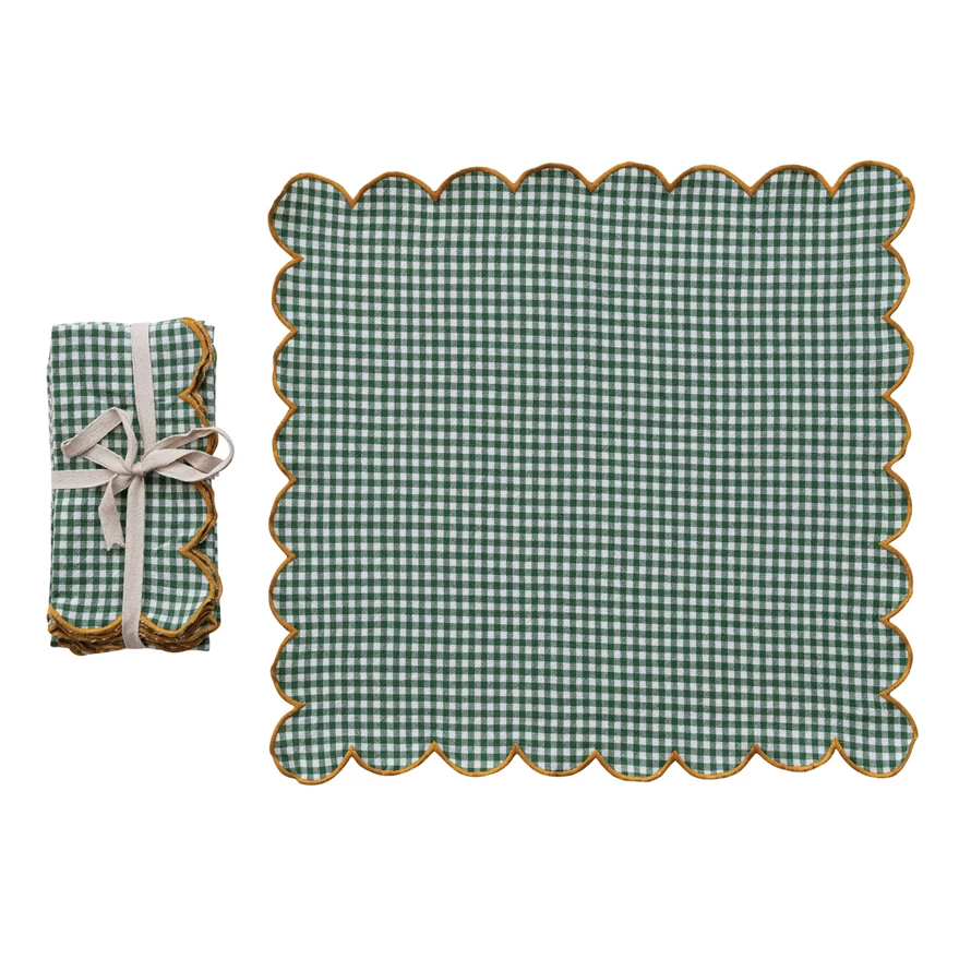 Catalog Name: 18" Square Cotton Scalloped Napkins w/ Contrasting Stitched Edges & Check Pattern, Green, White & Mustard Color, Set of 4 Tied w/ Cotton Tape