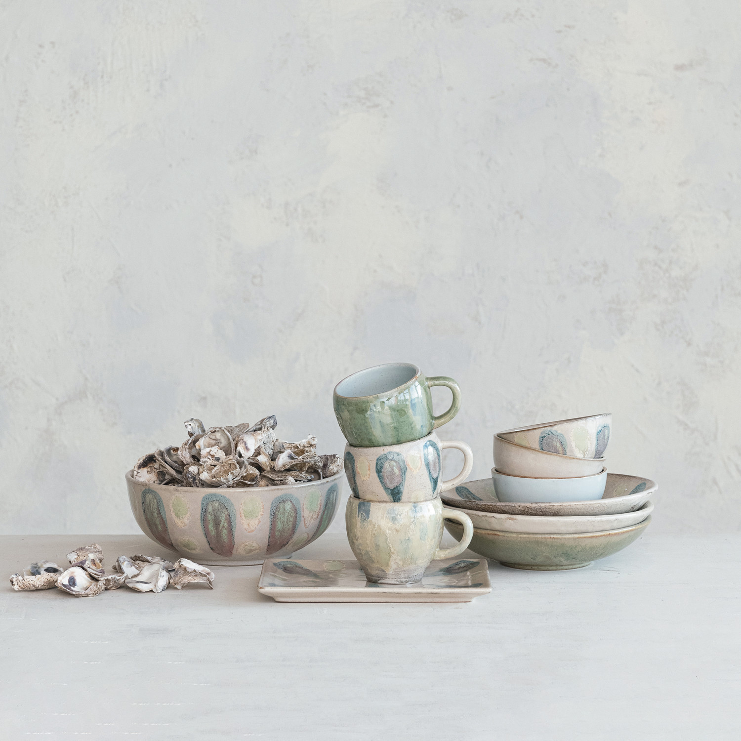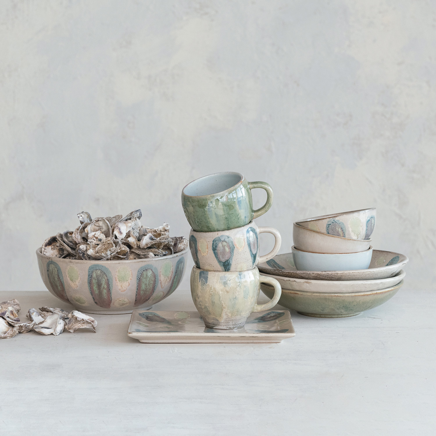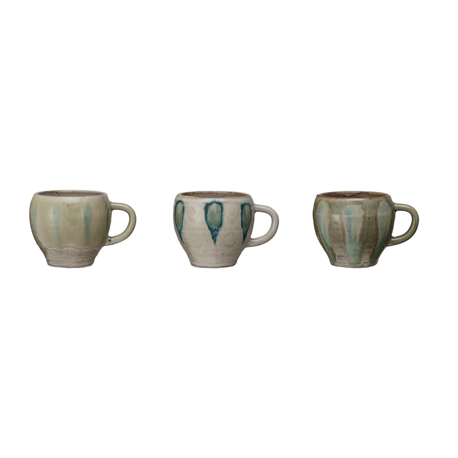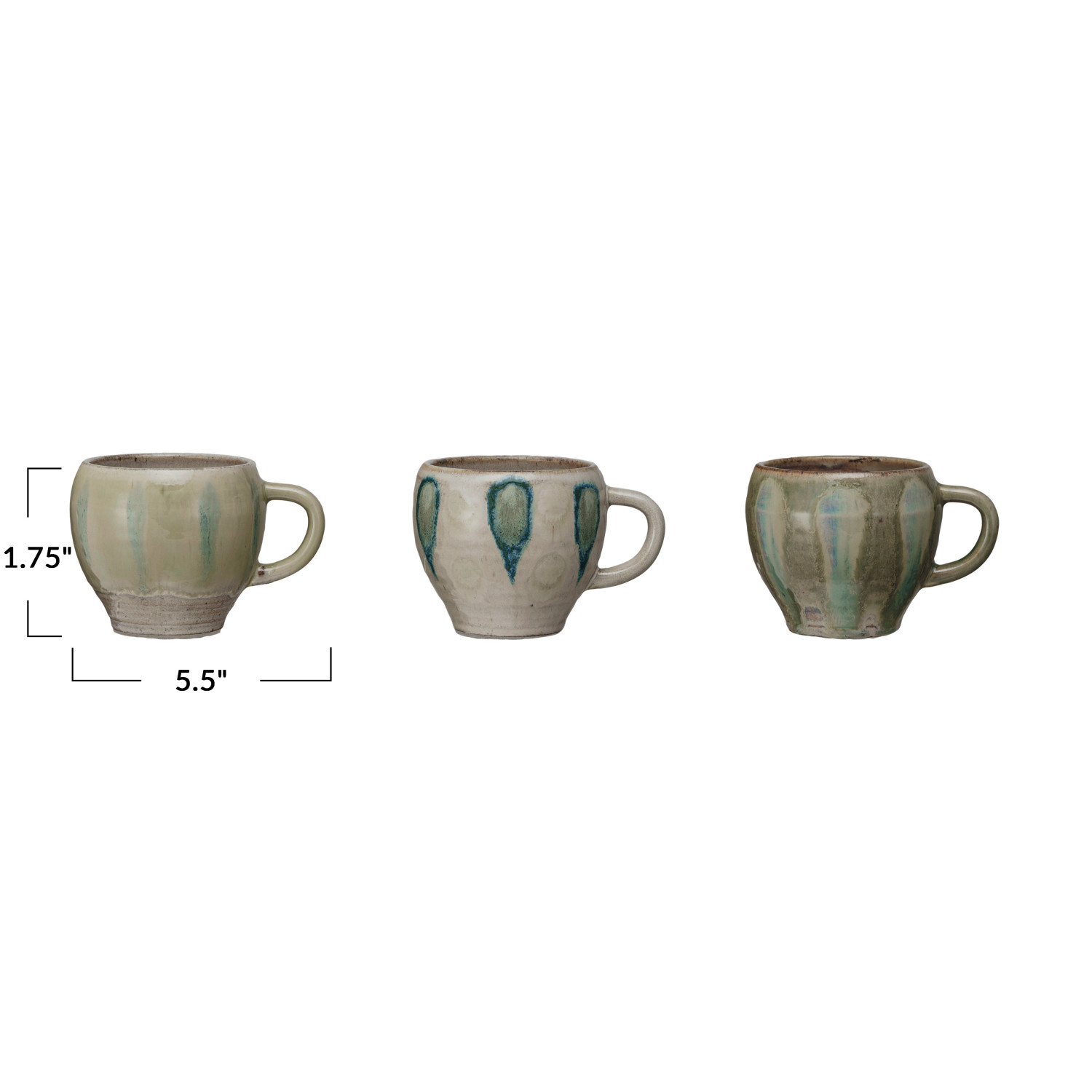 Catalog Name: 4" Round x 3-1/2"H 12 oz. Hand-Painted Stoneware Mug, Reactive Glaze, Green, Blue & Cream Color, 3 Styles (Each One Will Vary)