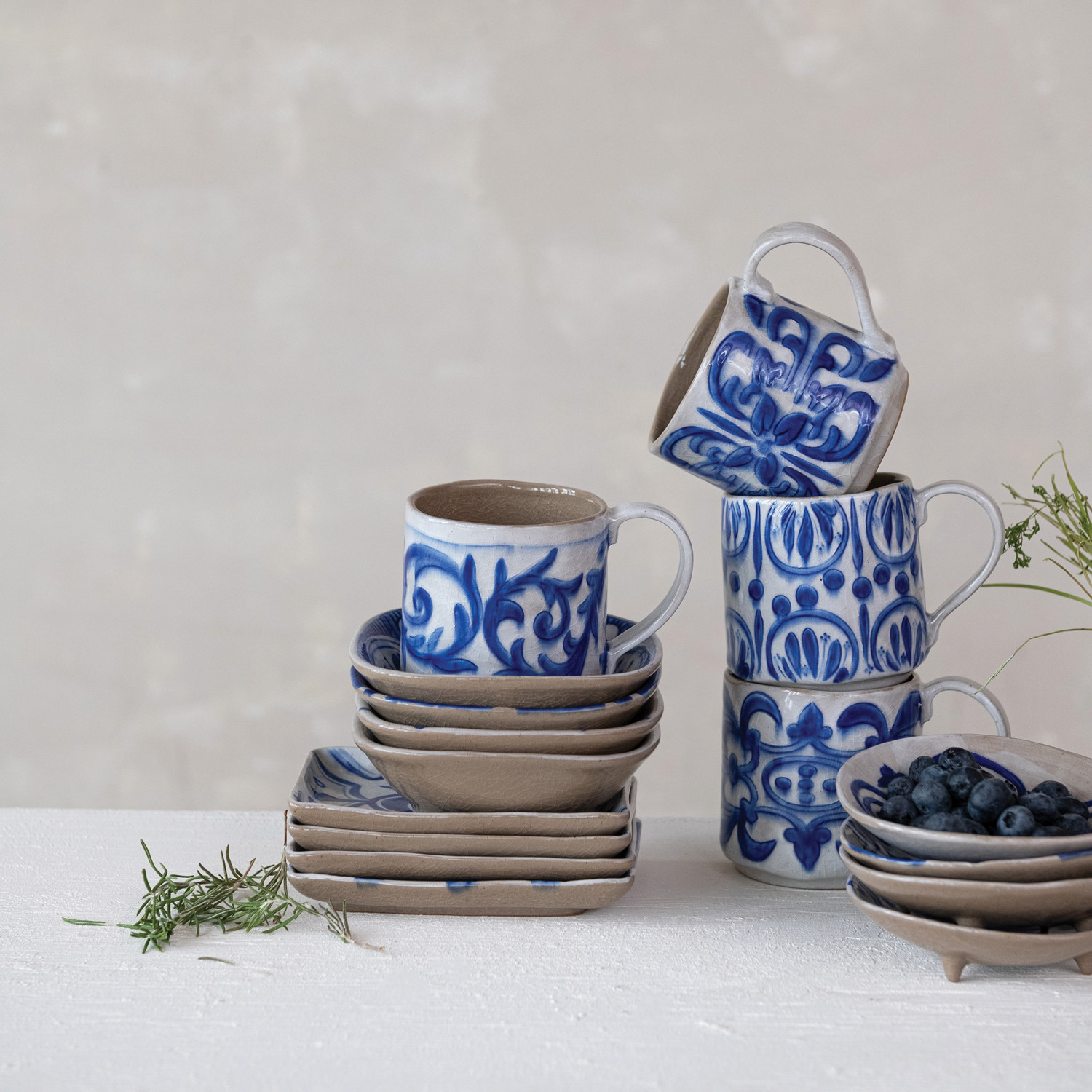 Catalog Name: 3-3/4" Round x 3-3/4"H 14 oz. Hand-Painted Stoneware Mug w/ Pattern, Crackle Glaze, Blue & White, 4 Styles (Each One Will Vary)