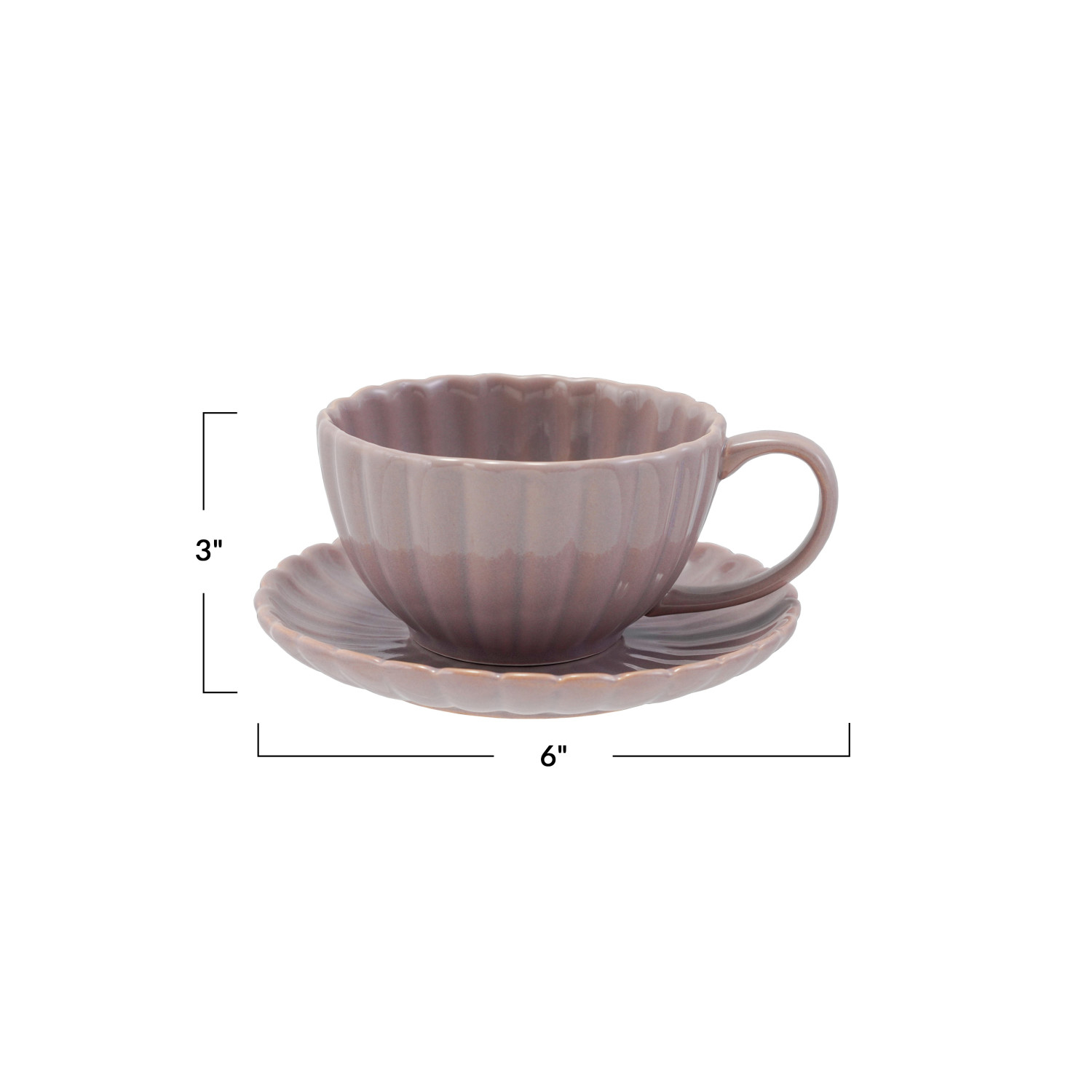 Catalog Name: 6" Round x 3"H 10 oz. Stoneware Ribbed Mug w/ Saucer, Reactive Glaze, Lavender Color, Set of 2 (Each One Will Vary)