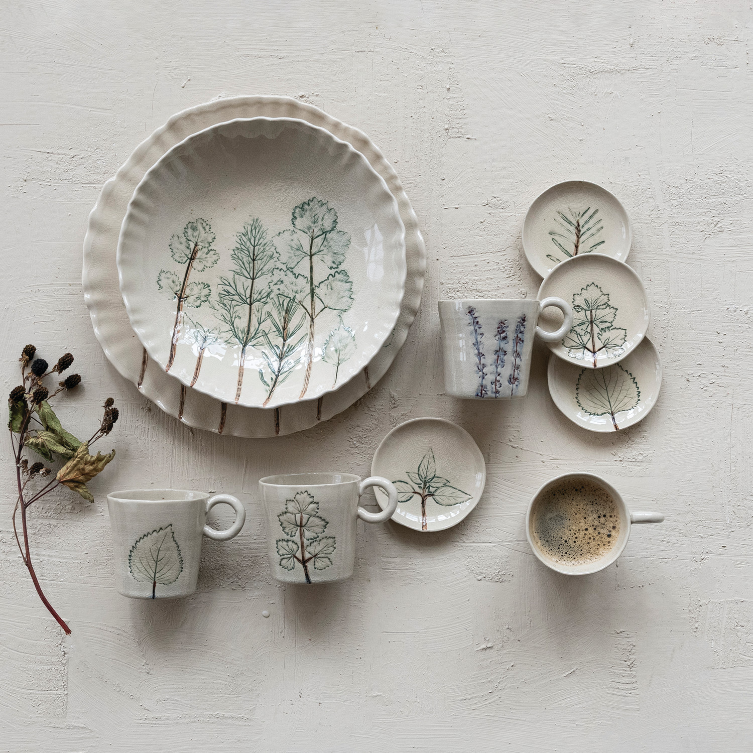 12 oz. Hand-Painted Stoneware Mug with Botanical, Cream Color, 4 Styles (Each One Will Vary)