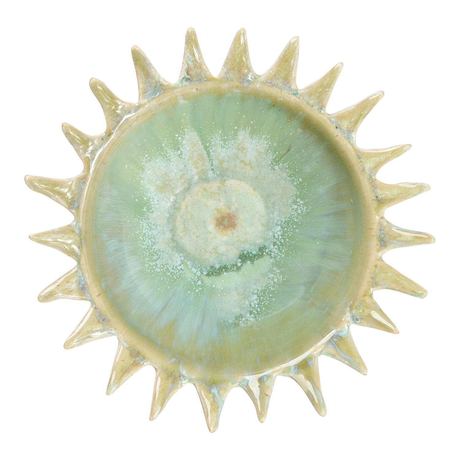 Catalog Name: 8-1/2" Round x 3"H Stoneware Sunburst Shaped Serving Bowl, Opal Reactive Glaze, Celadon Color (Each One Will Vary)