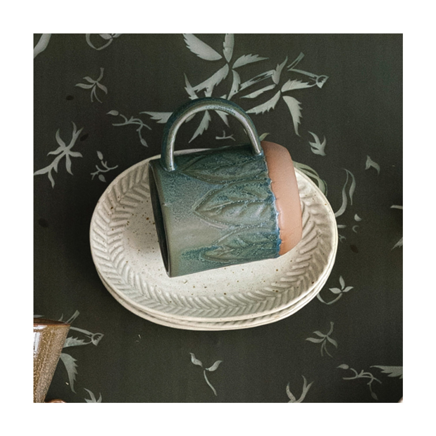 This intricately embossed stoneware plate showcases a naturally variating reactive glaze.