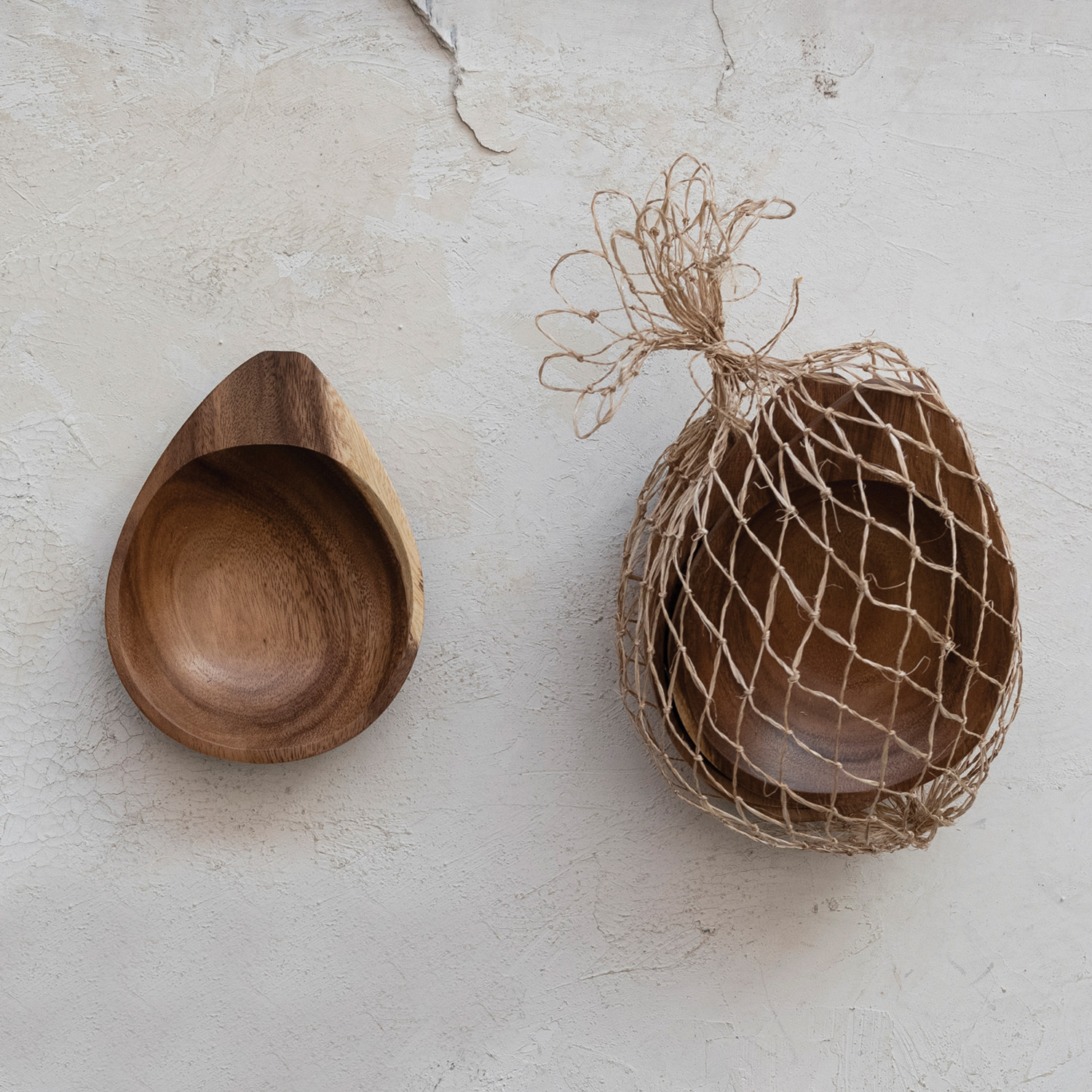 Catalog Name: 6-1/2"L x 5"W Acacia Wood Bowls, Natural, Set of 4 in Abaca Net Bag