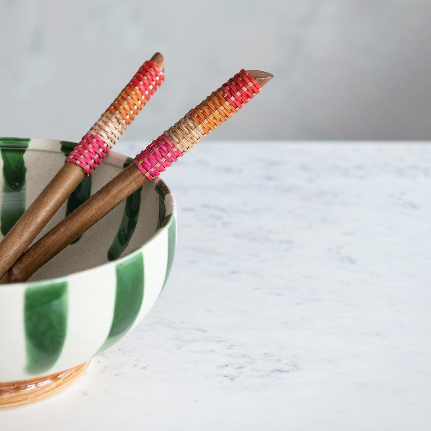 Catalog Name: 12"L Teakwood Salad Servers w/ Rattan Wrapped Handles, Multi Color, Set of 2 in Printed Drawstring Bag