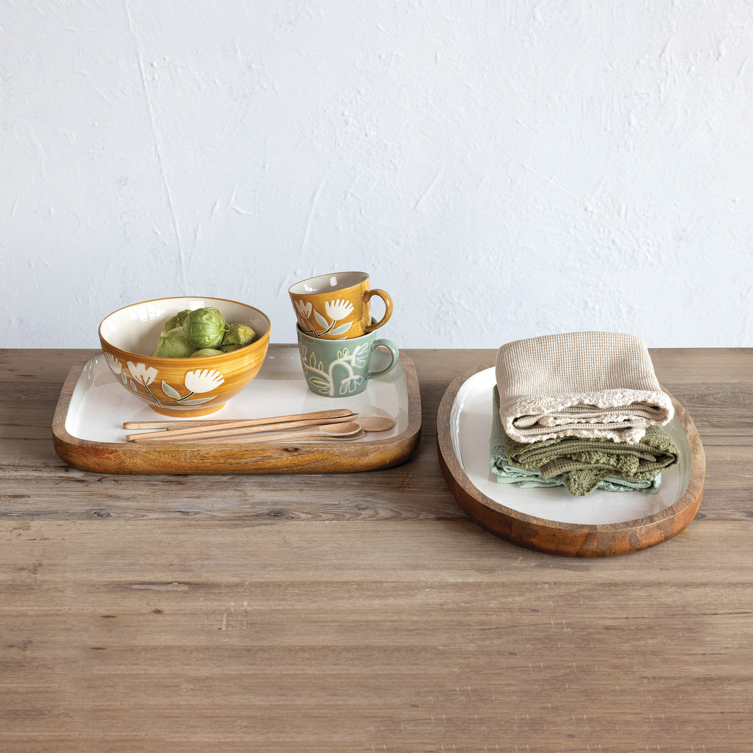 Enameled Mango Wood Tray, White & Natural