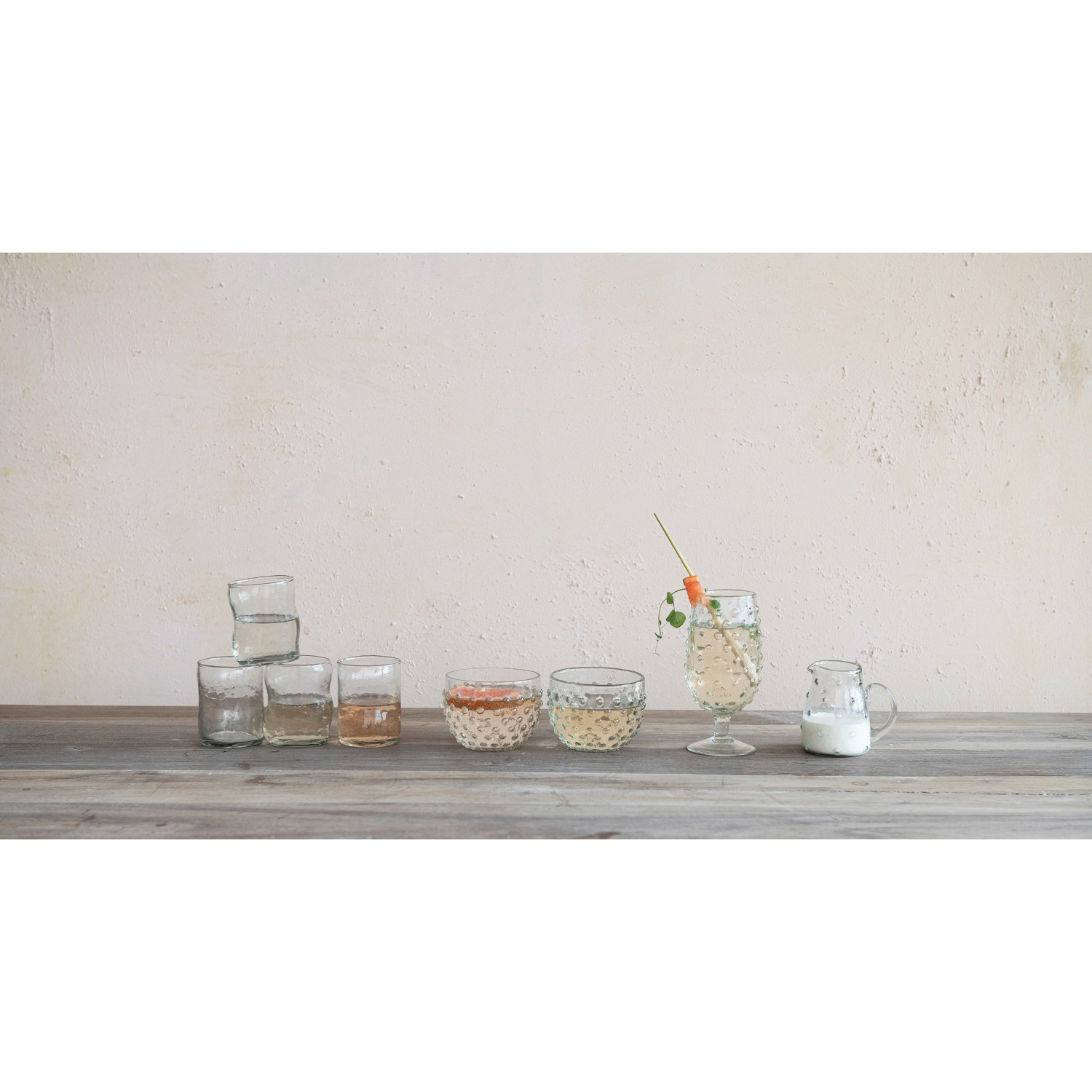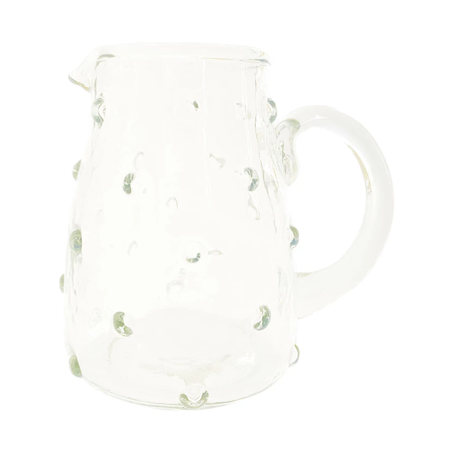 This reclaimed glass hobnail creamer is a charming and versatile serveware piece that can sweeten up any dining or living space. The creamer features a hobnail pattern that creates a subtle sparkle and a spout that makes it easy to pour. The clear glass material is made of reclaimed glass that is eco-friendly and unique. The creamer can be used as a creamer to add some cream to the coffee, tea, or hot chocolate, or as a decorative item to display on a shelf or table. The creamer measures 4 inches in length, 3 inches in width, and 3.75 inches in height, with a capacity of 8 ounces. It is a perfect choice for anyone who loves farmhouse, cottagecore, French country, or coastal style.