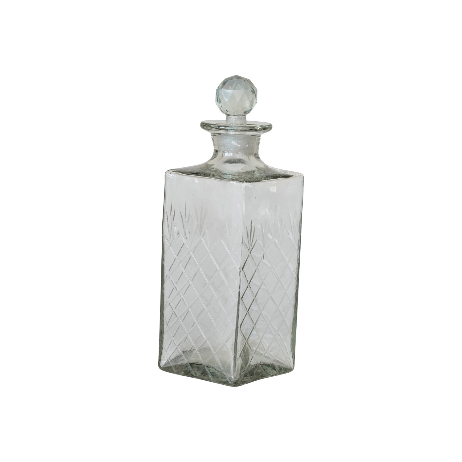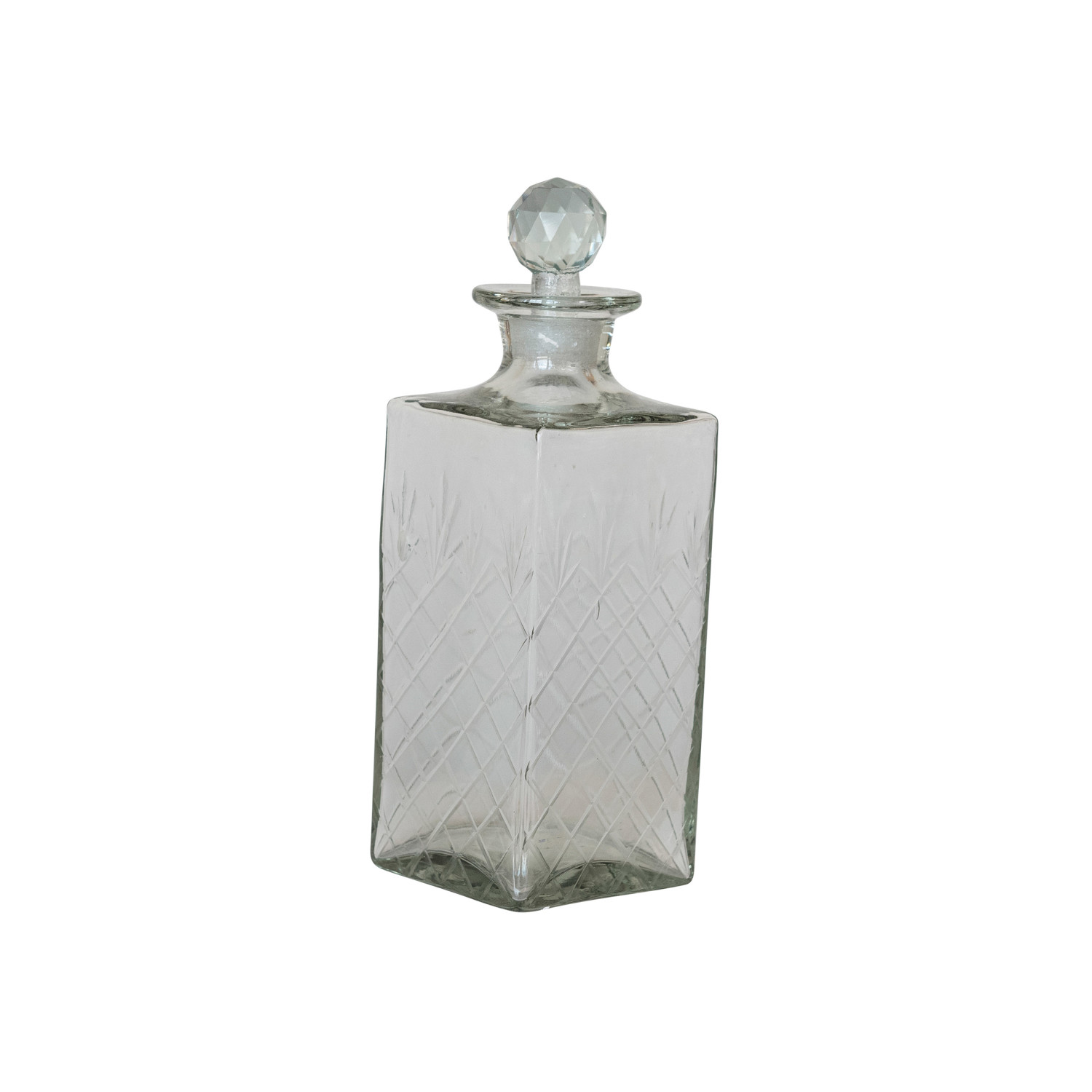 This reclaimed etched square glass decanter is a elegant and versatile serveware piece that can elevate any dining or living space. The decanter features a etched geometric design that adds a touch of sophistication and style. The square stopper fits perfectly on the top of the decanter, preventing any spills or dust. The clear glass material is made of reclaimed glass that is eco-friendly and unique, as each decanter is handcrafted by skilled artisans. The decanter can be used as a decanter to serve wine, water, or liquor, enhancing the flavor and aroma of the beverages. The decanter can also be used as a vase to display fresh or dried flowers, adding some color and freshness to any room. The decanter measures 3.25 inches in length and width, and 10 inches in height, with a capacity of 16 ounces. It is a perfect choice for anyone who loves farmhouse, cottagecore, French country, or coastal style.