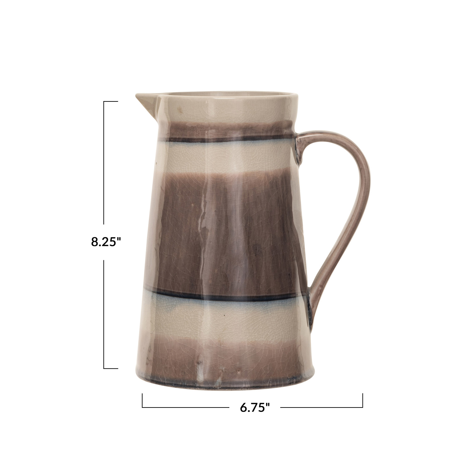 This brown and cream stoneware pitcher with stripes and crackle glaze is a perfect addition to the serveware collection. This pitcher has a cozy and rustic design that features brown and cream stripes that contrast with the white background. The pitcher also has a reactive crackle glaze finish that creates a textured and varied look that makes each pitcher unique and special. The pitcher is made of stoneware, which is a sturdy and durable material that can withstand high temperatures and frequent use. The pitcher can hold up to 64 ounces of liquid and can be used for serving water, juice, tea, or any other beverage. The pitcher can blend with any style, from farmhouse to lodge to cabin to coastal to transitional, and add a warm and inviting touch to the table. The pitcher measures 6.75 inches in length, 5.25 inches in width, and 8.25 inches in height, making it generous enough to serve a large group of guests. Use it for everyday dining or special occasions, this brown and cream stoneware pitcher with stripes and crackle glaze will impress the guests and enhance the beverage presentation.