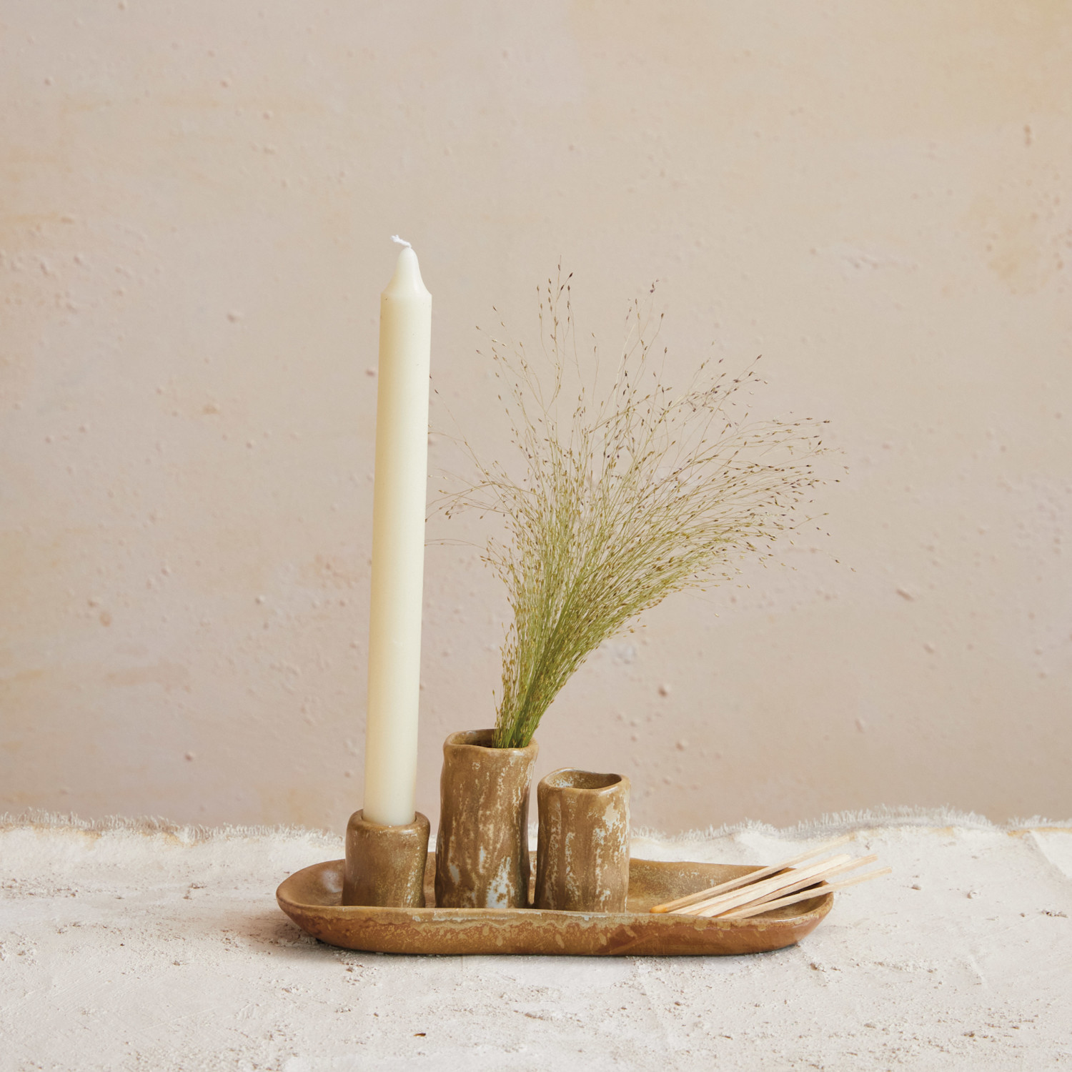 Catalog Name: 9-1/4"L x 3-1/2"W x 3-1/4"H (2) Stoneware Vases & Taper Holder on Tray, Reactive Glaze, Brown (Each One Will Vary)