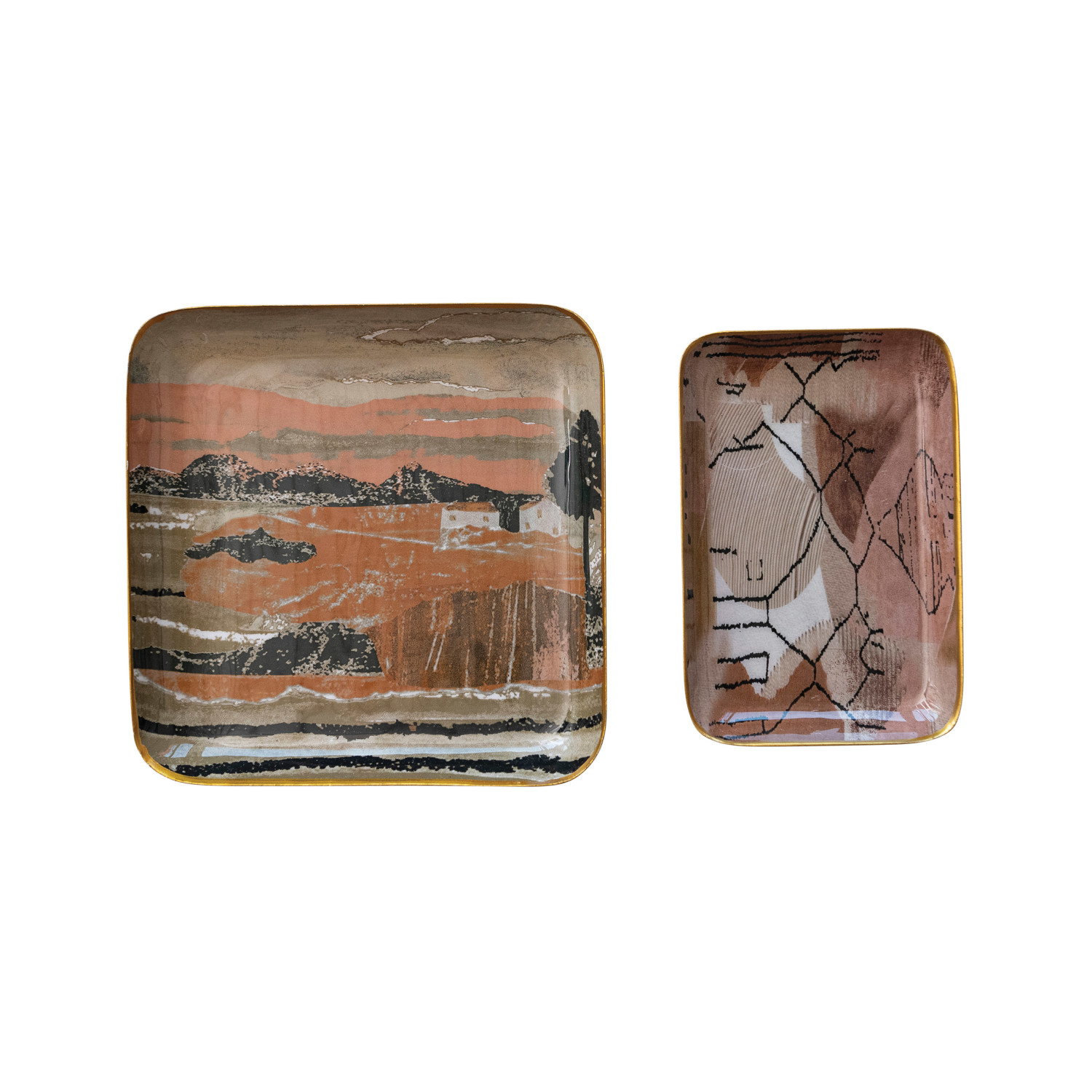 Catalog Name: 7" Square & 6"L x 4"W Enameled Metal Trays w/ Landscape/Abstract Image & Gold Edges, Multi Color, Set of 2